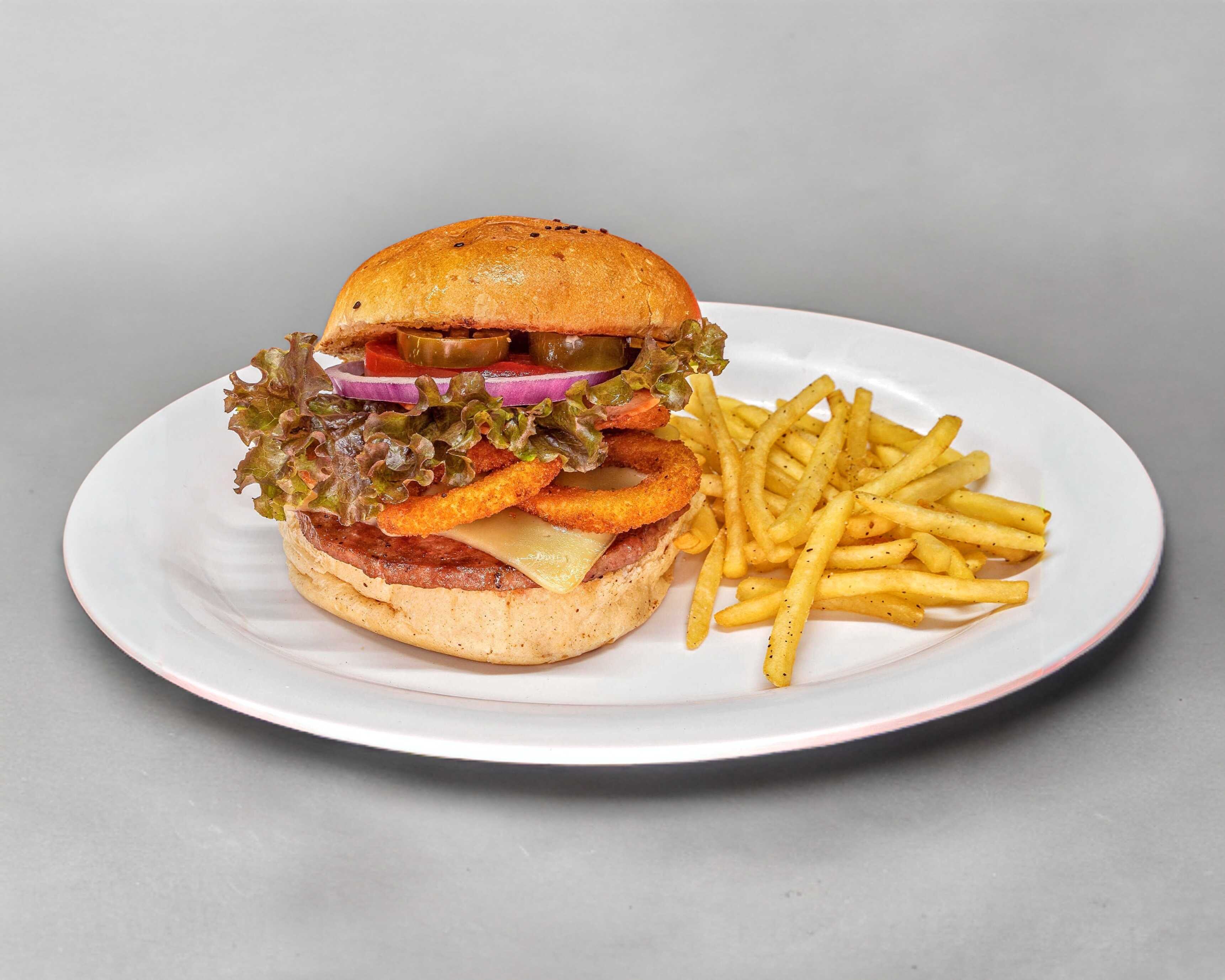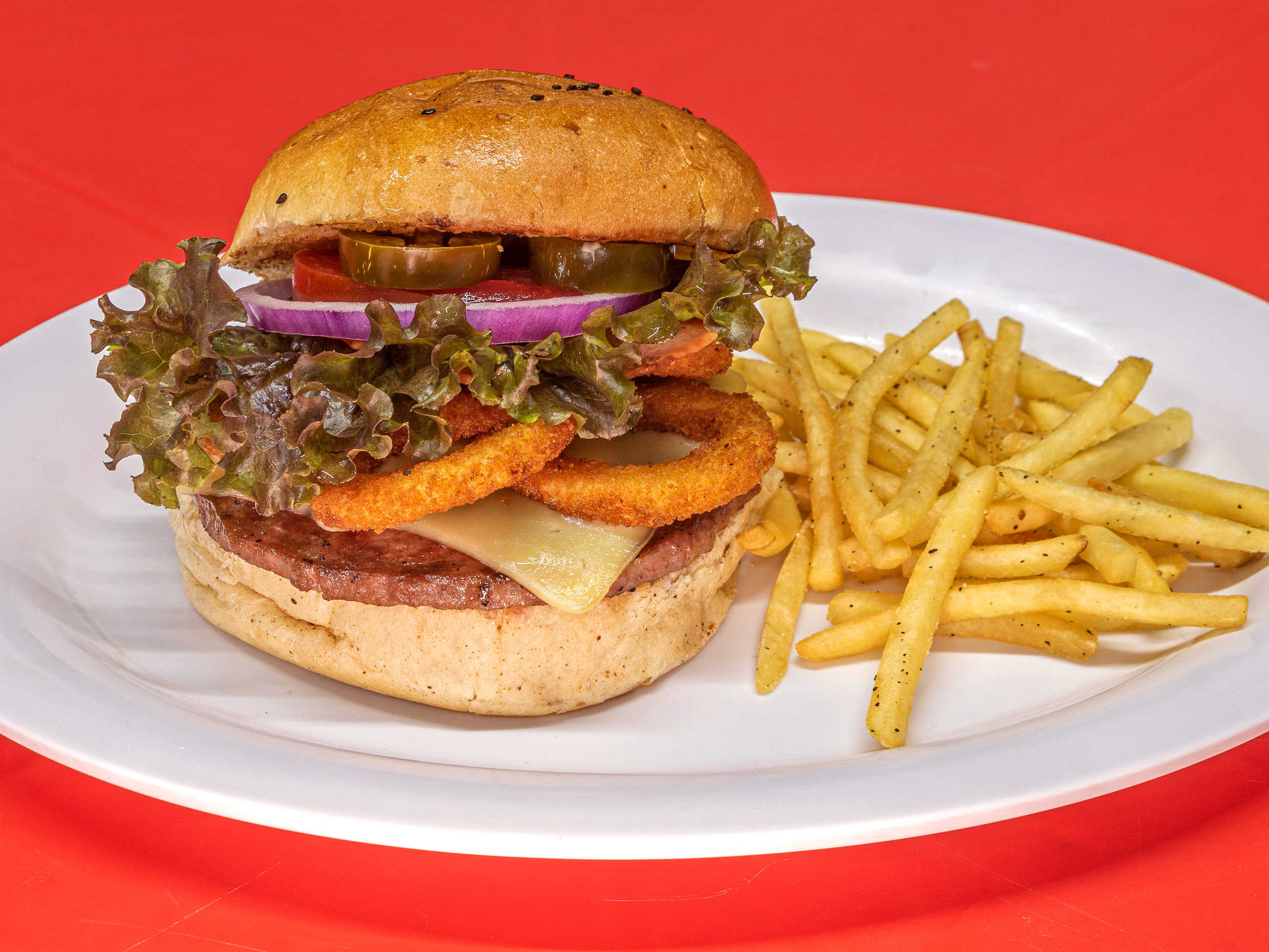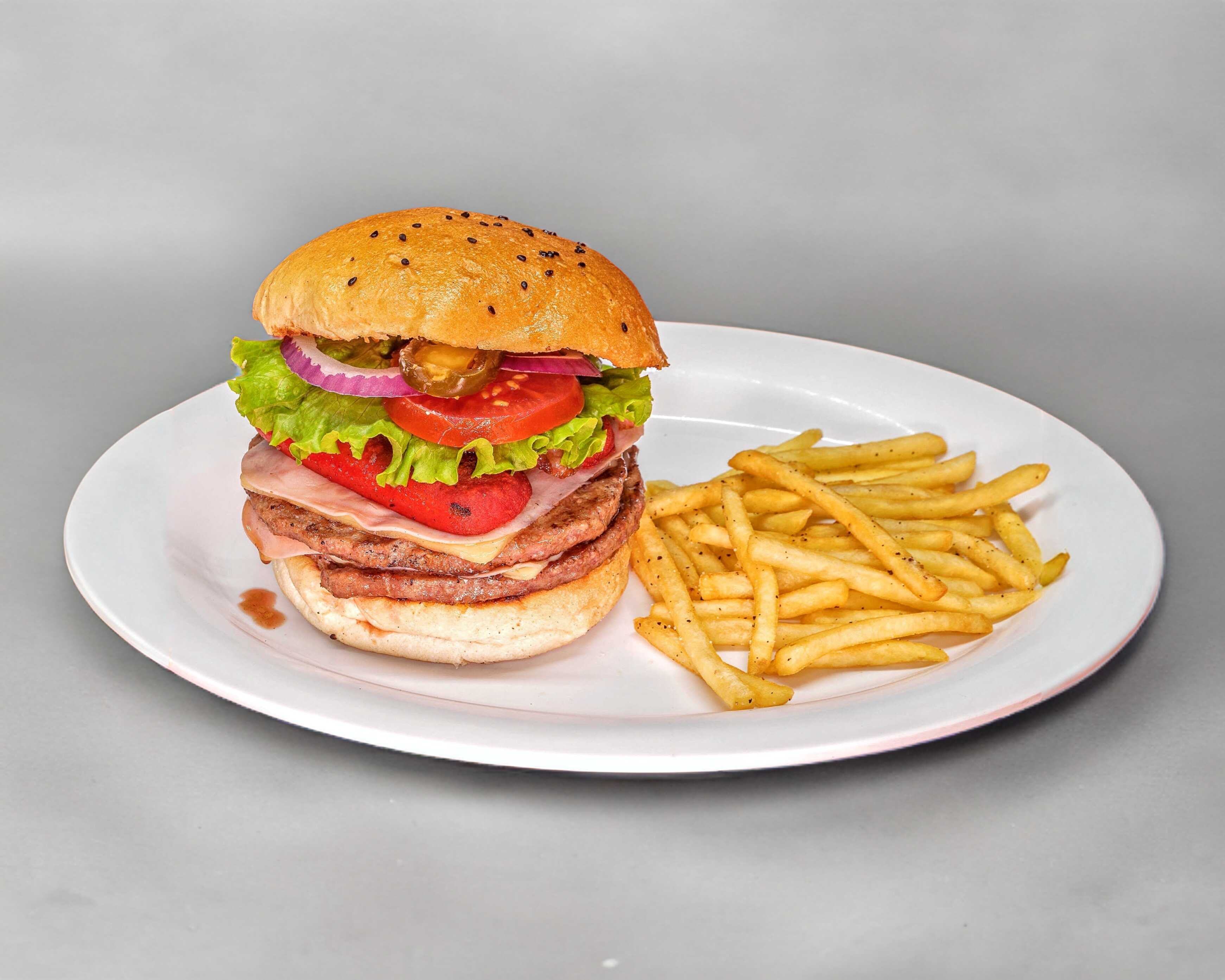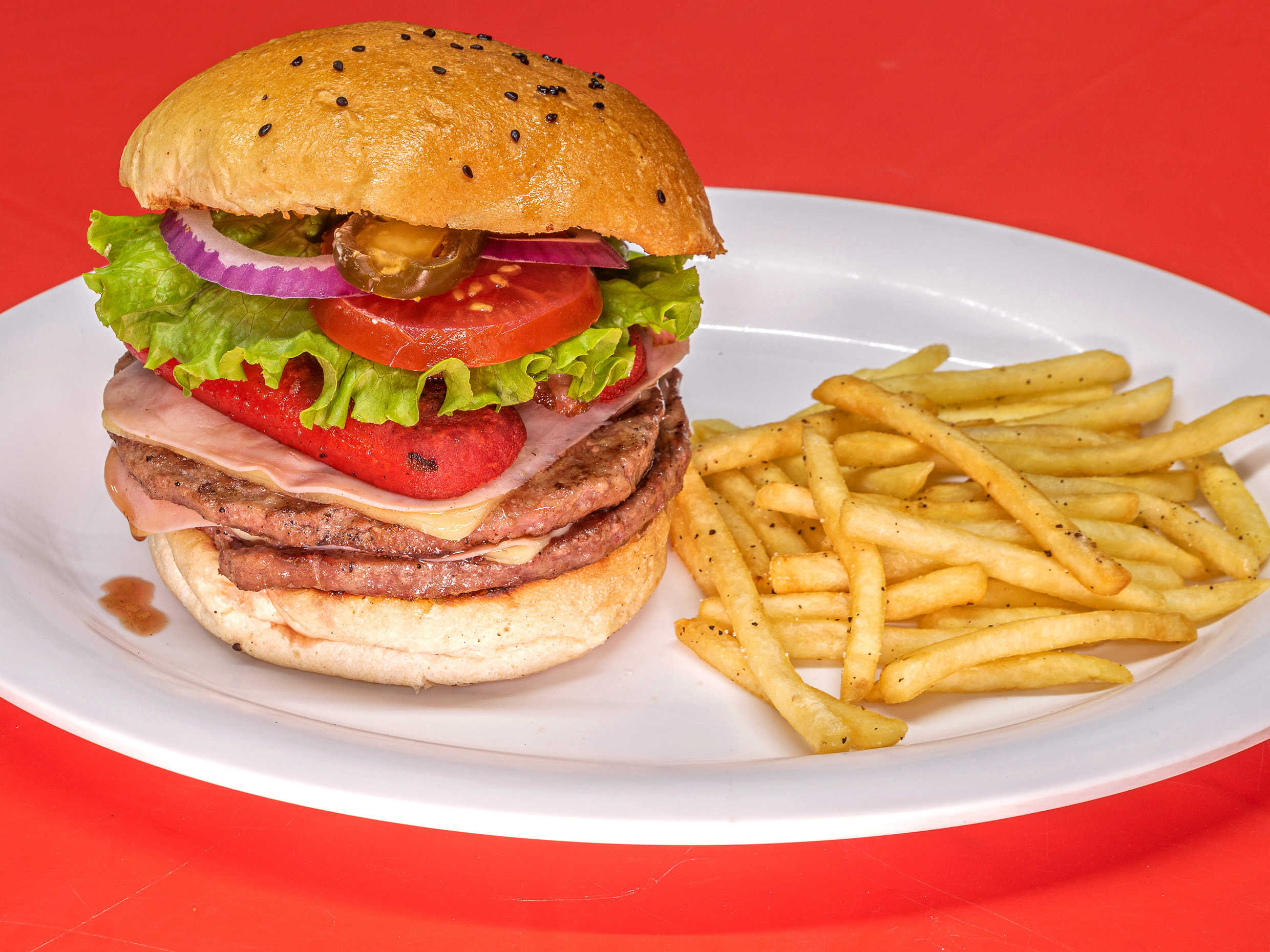 Queso gouda, jamón y champiñones, carne de res de 150 gr, con porción de papas.