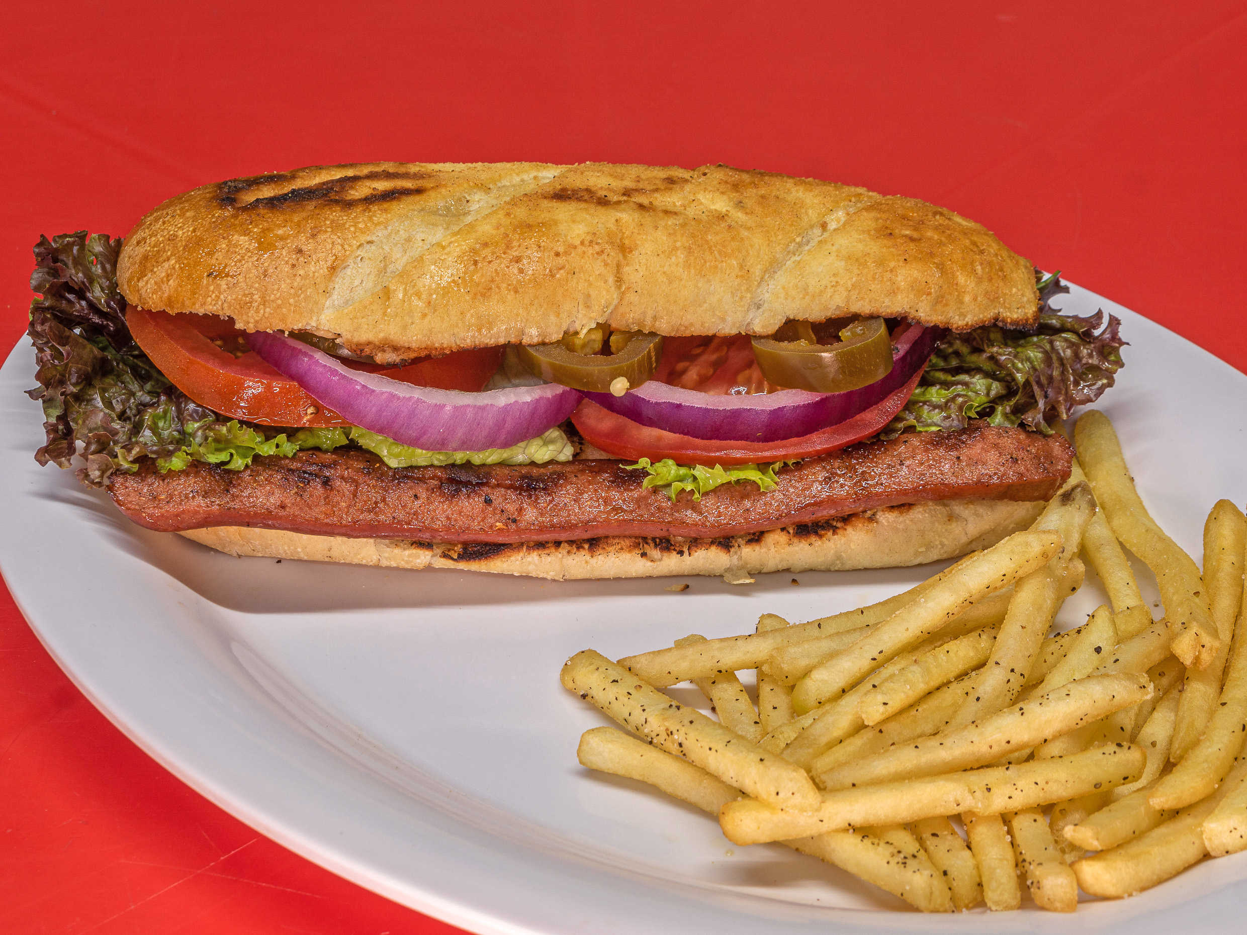 Jugosa salchicha de res y cerdo, incluye porción de papas.