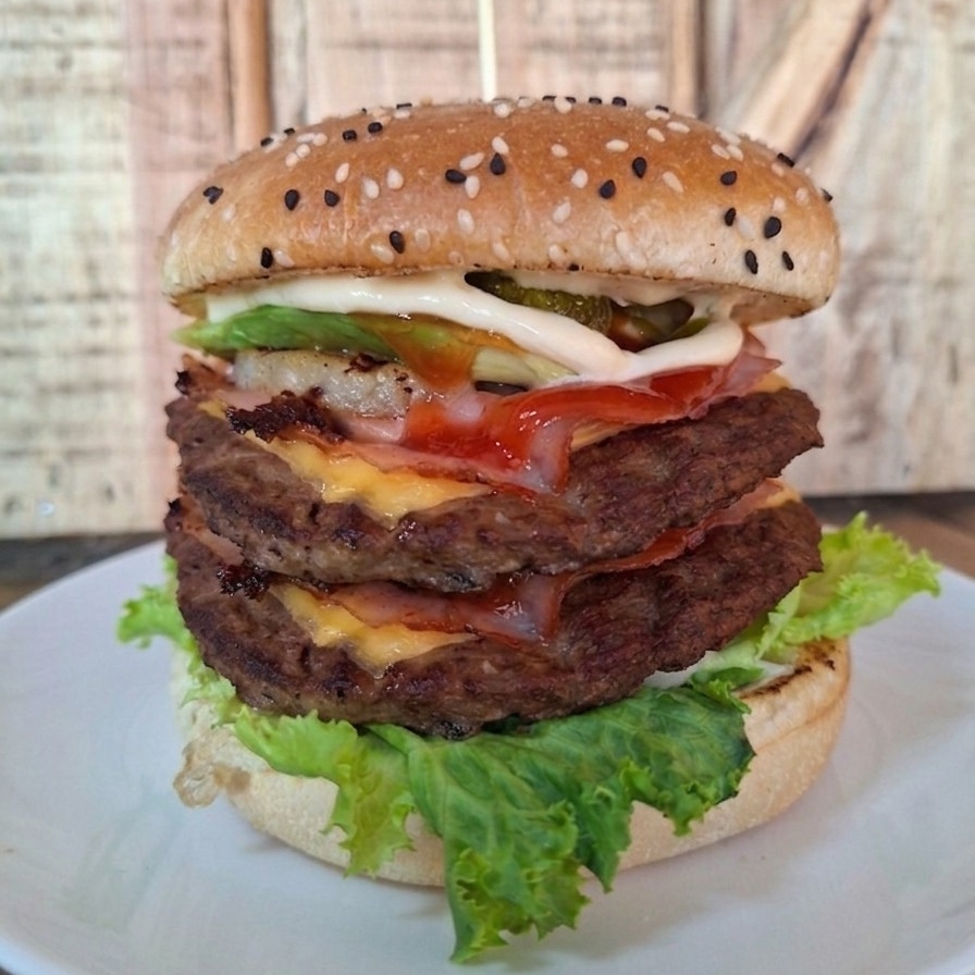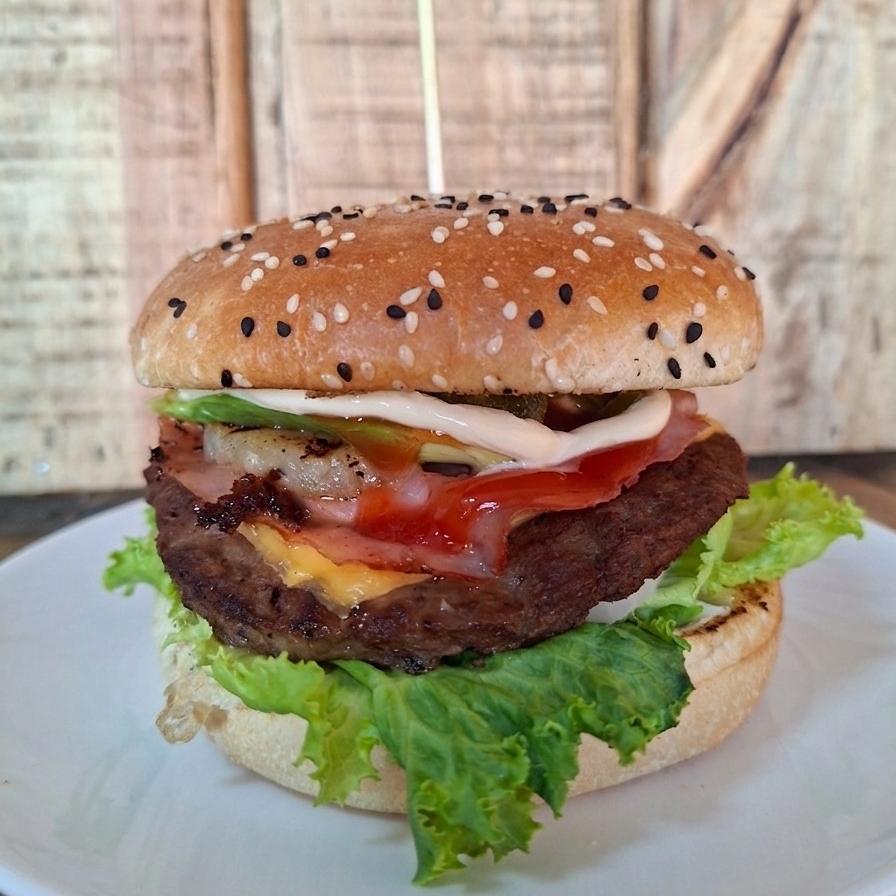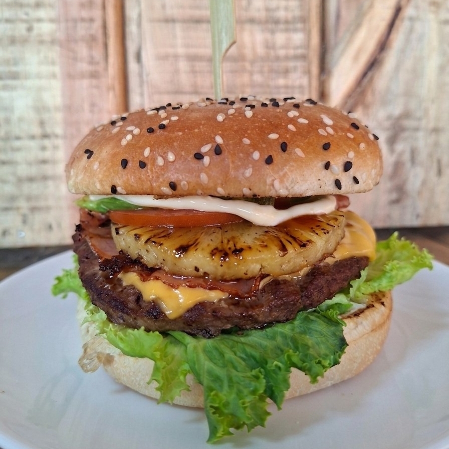 100 grs de carne de res 100%, lechuga , jitomate, cebolla, chlies, aguacate, queso amarillo, captsu, mayonesa, jamon y piña