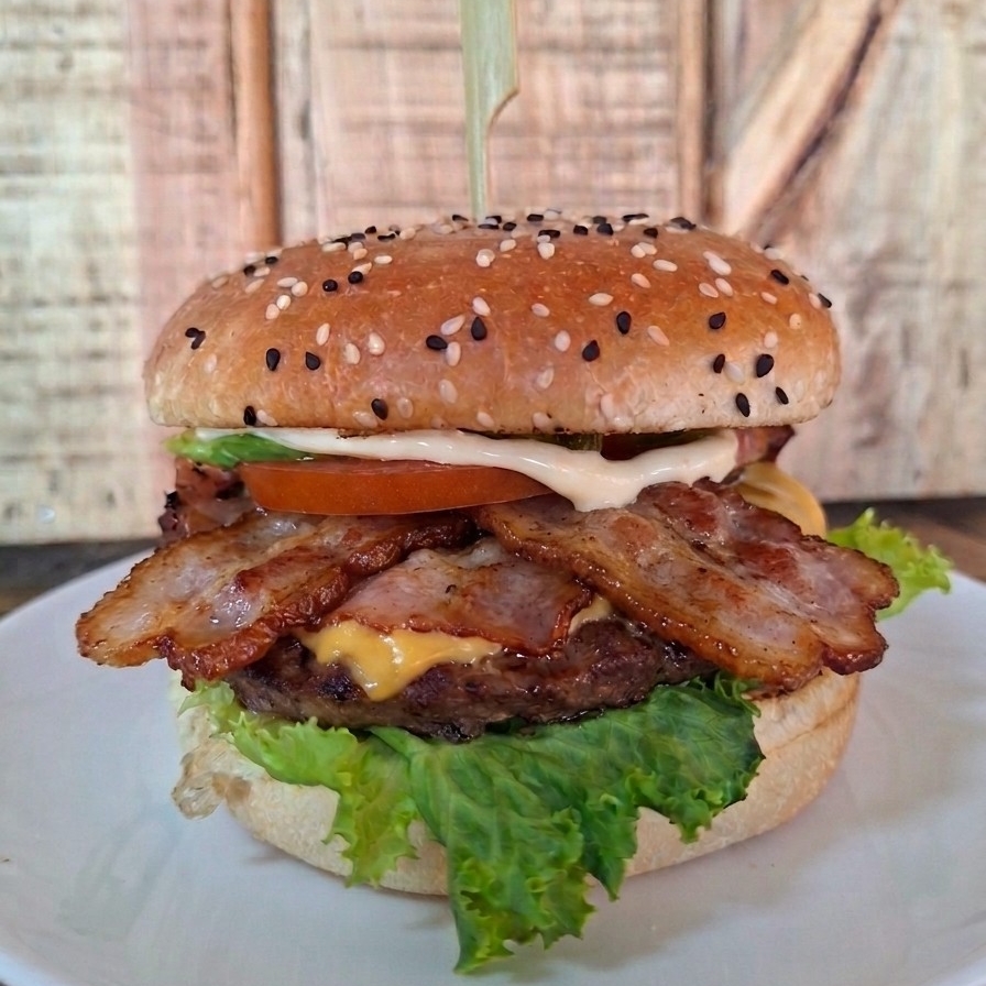 100 grs de carne de res 100%, lechuga , jitomate, cebolla, chlies, aguacate, queso amarillo, captsu, mayonesa, tocino