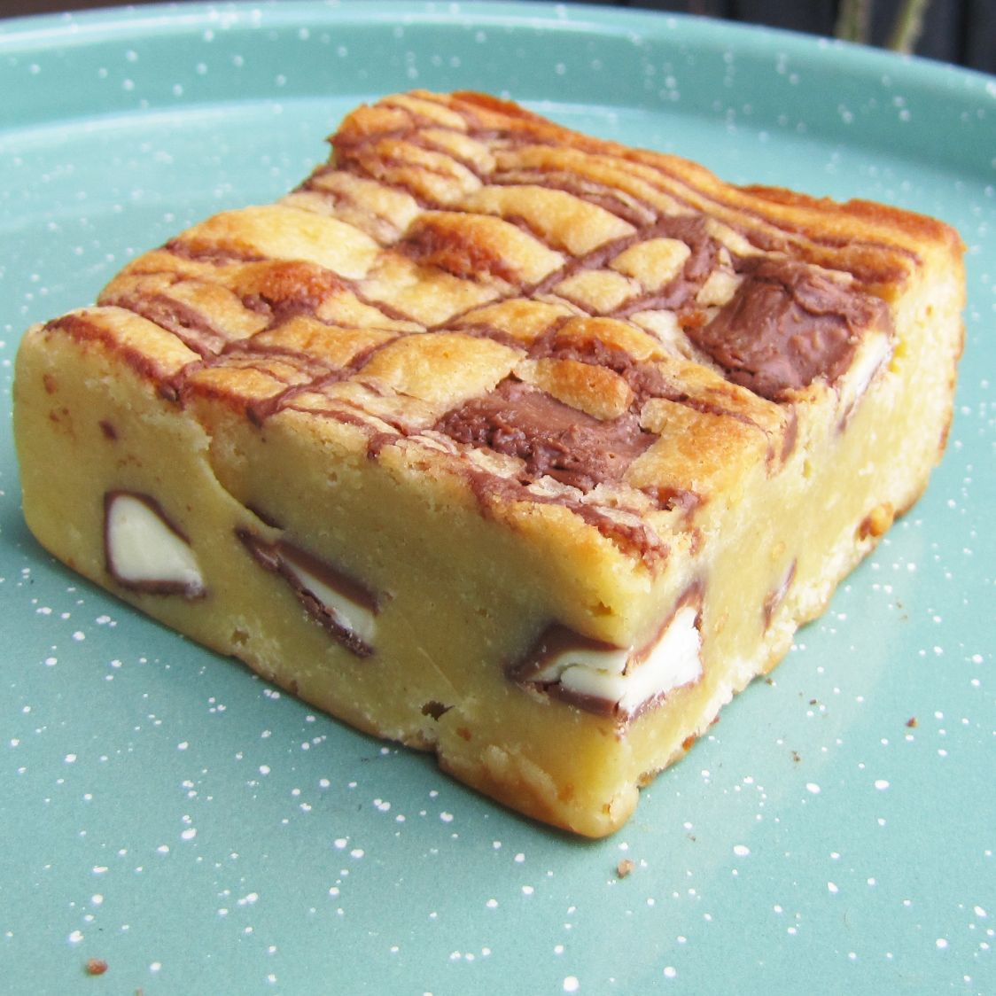 Blondie de vanilla con chocolate blanco, trozos de chocolate kinder y nutella