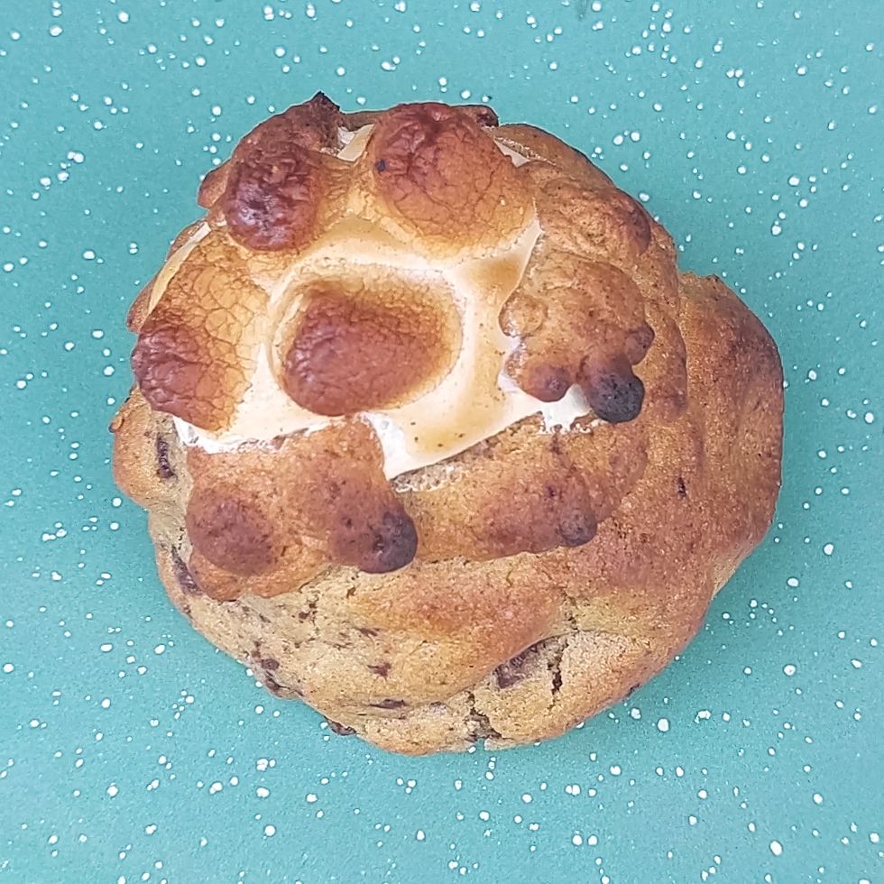 Galleta crujiente por fuera y suave por dentro rellena de crema de malvavisco y chocolate, con un toque de canela