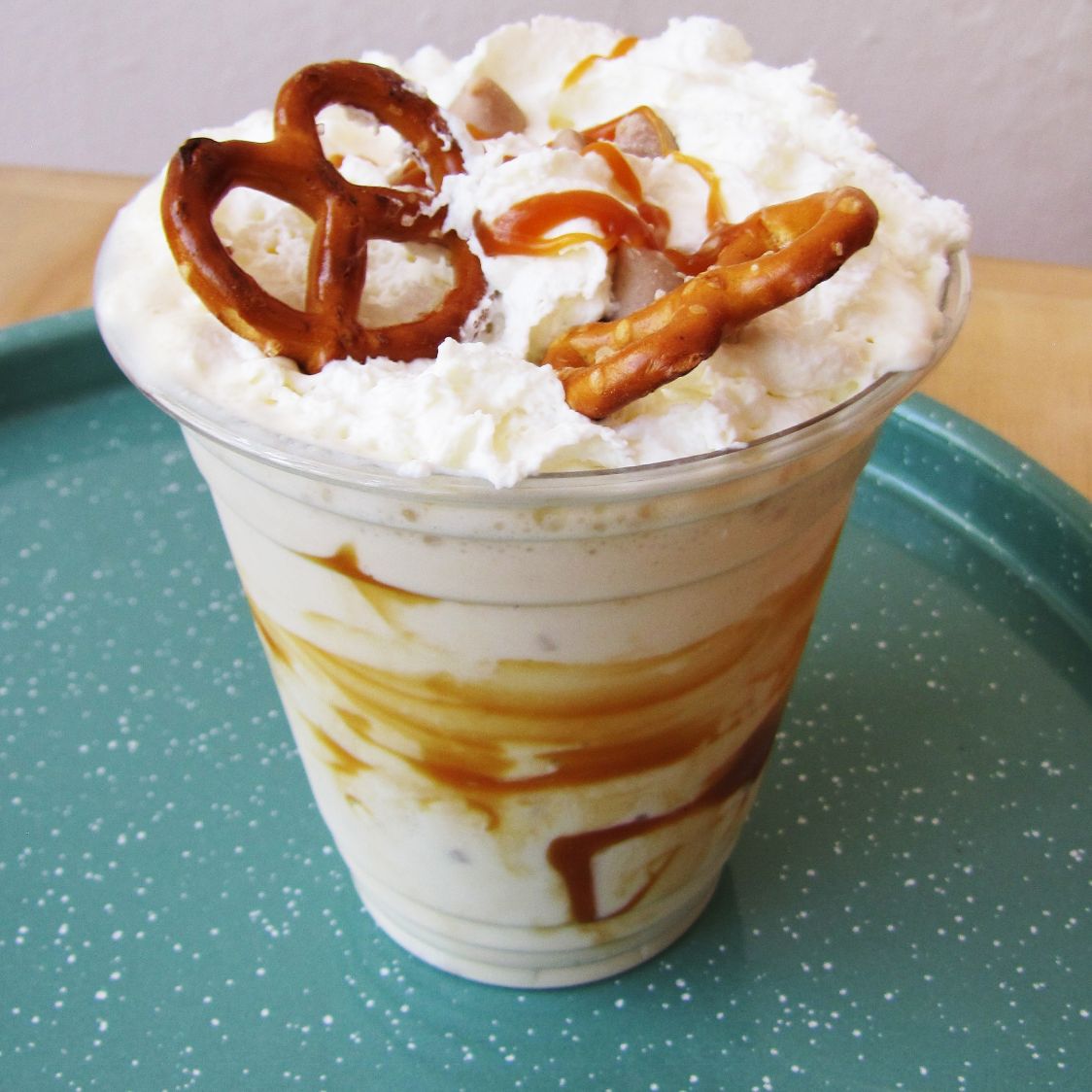 Malteada de helado de vainilla batida con caramelo salado, chispas de caramelo y pretzel