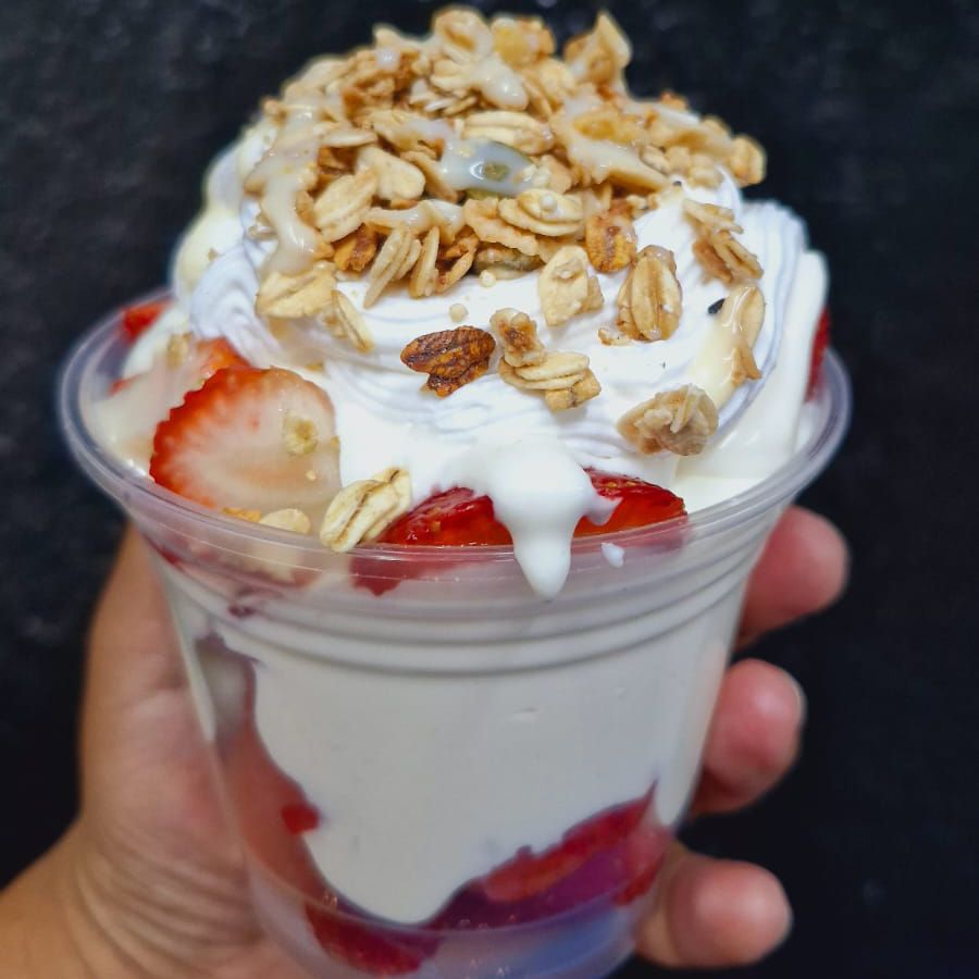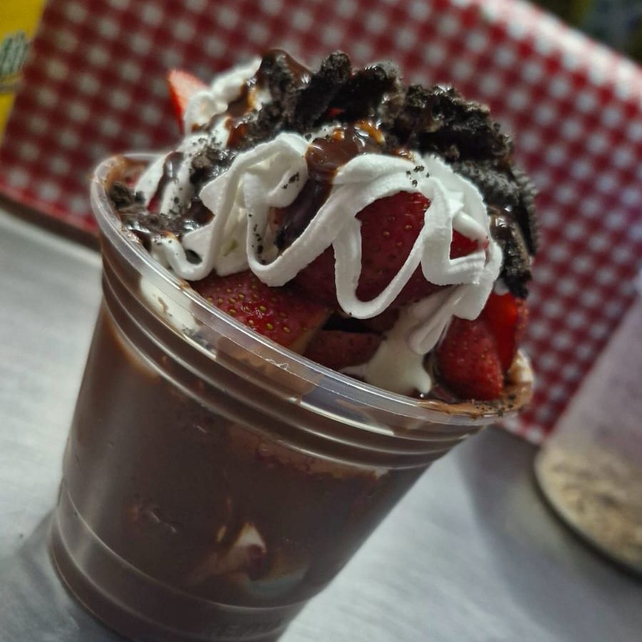Fresas con crema dulce, c/ Nutella, crema batida y chispas de chocolate.