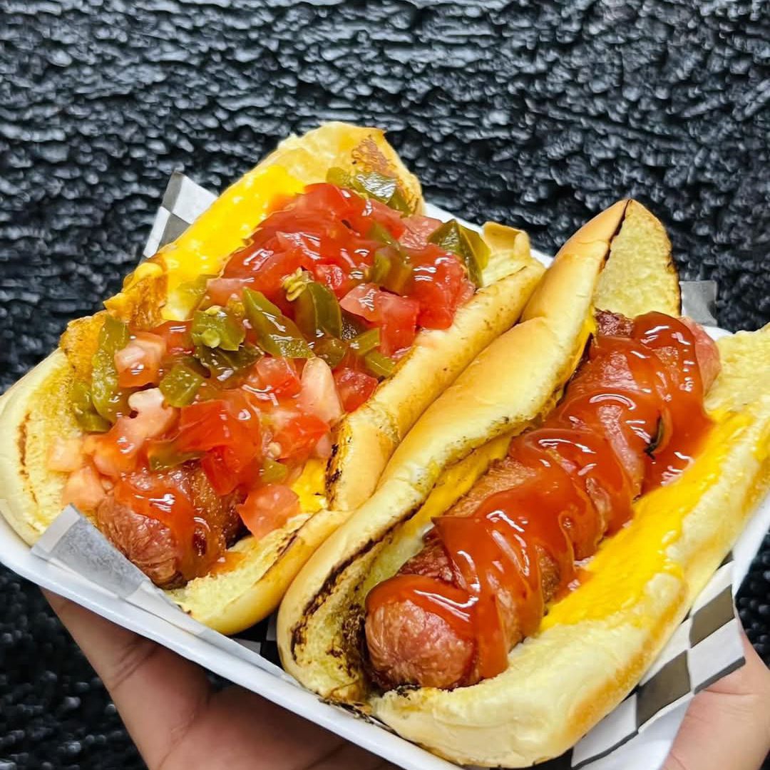 Salchicha de pavo, queso amarillo, chiles, jitomate, cebolla, mayonesa y catsup.