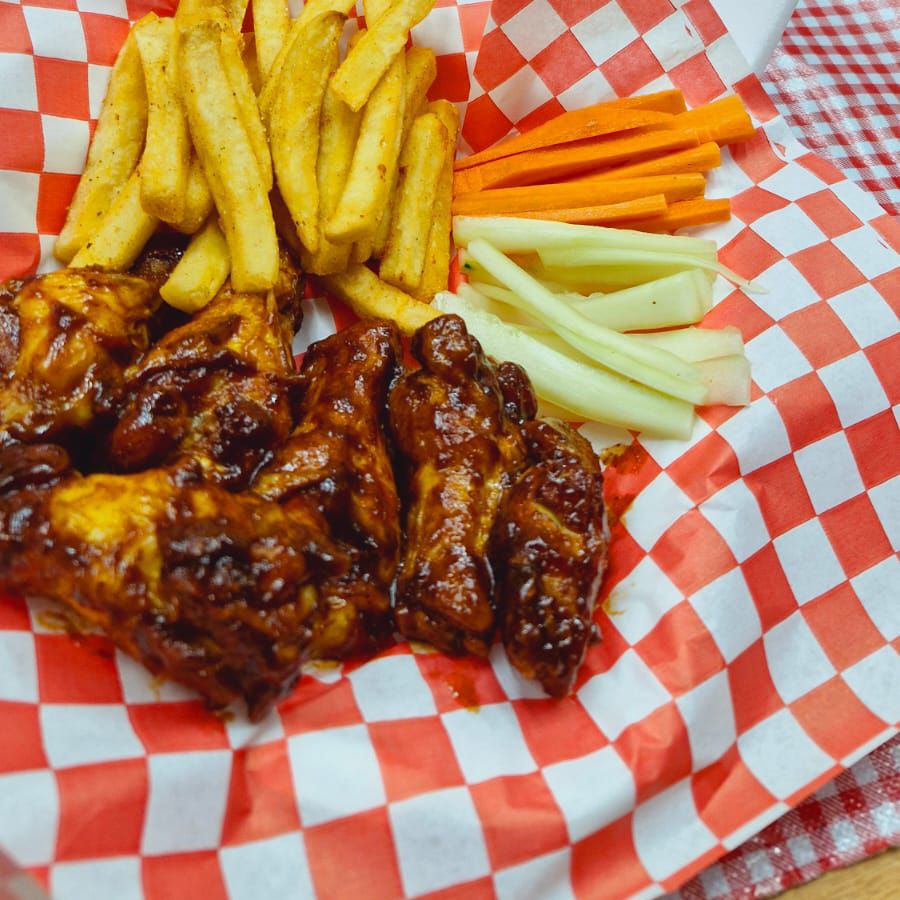 6pz de alitas bañadas en deliciosa salsa lemon pepper acompañadas con papas y vegetales, con aderezo ranch.