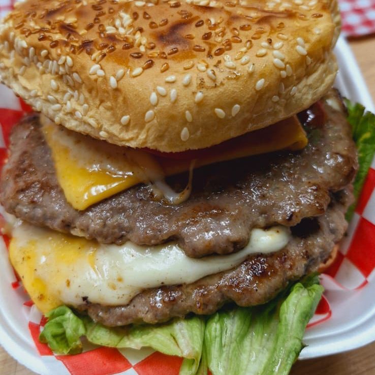 Doble carne de res, doble porción de queso amarillo y blanco, aguacate, jitomate, lechuga, chiles, mayonesa y catsup.