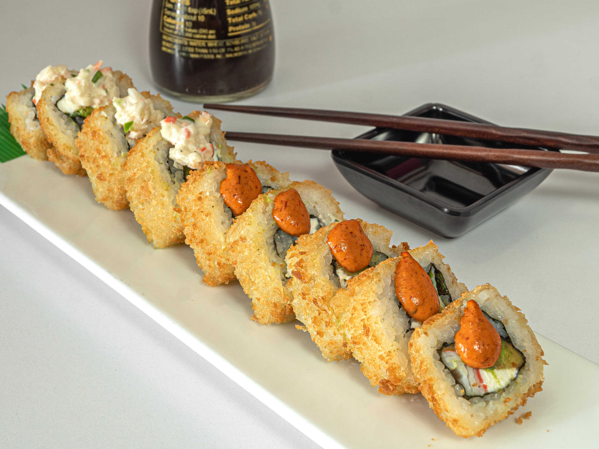Rollo con verdura capeada por fuera; aguacate, queso y cangrejo por dentro bañado con salsa dulce y ajonjolí.