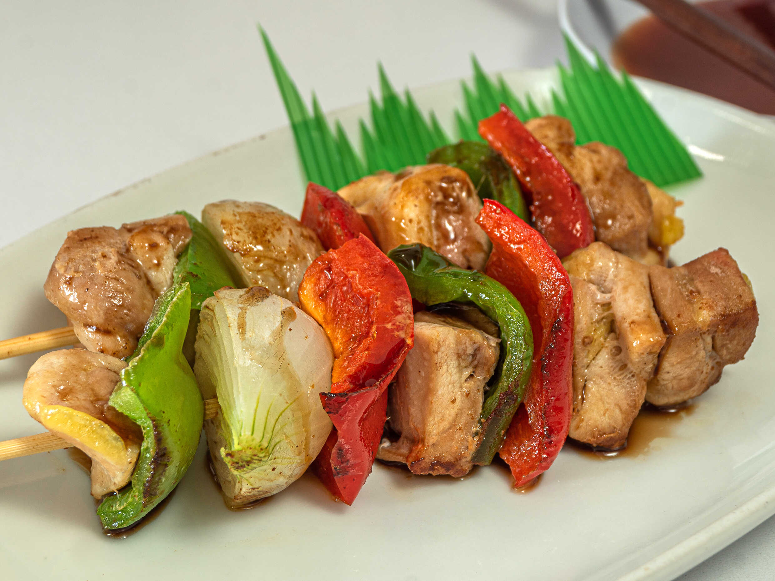 2 Piezas. Brocheta de pollo con pimiento asada bañada en salsa dulce.
