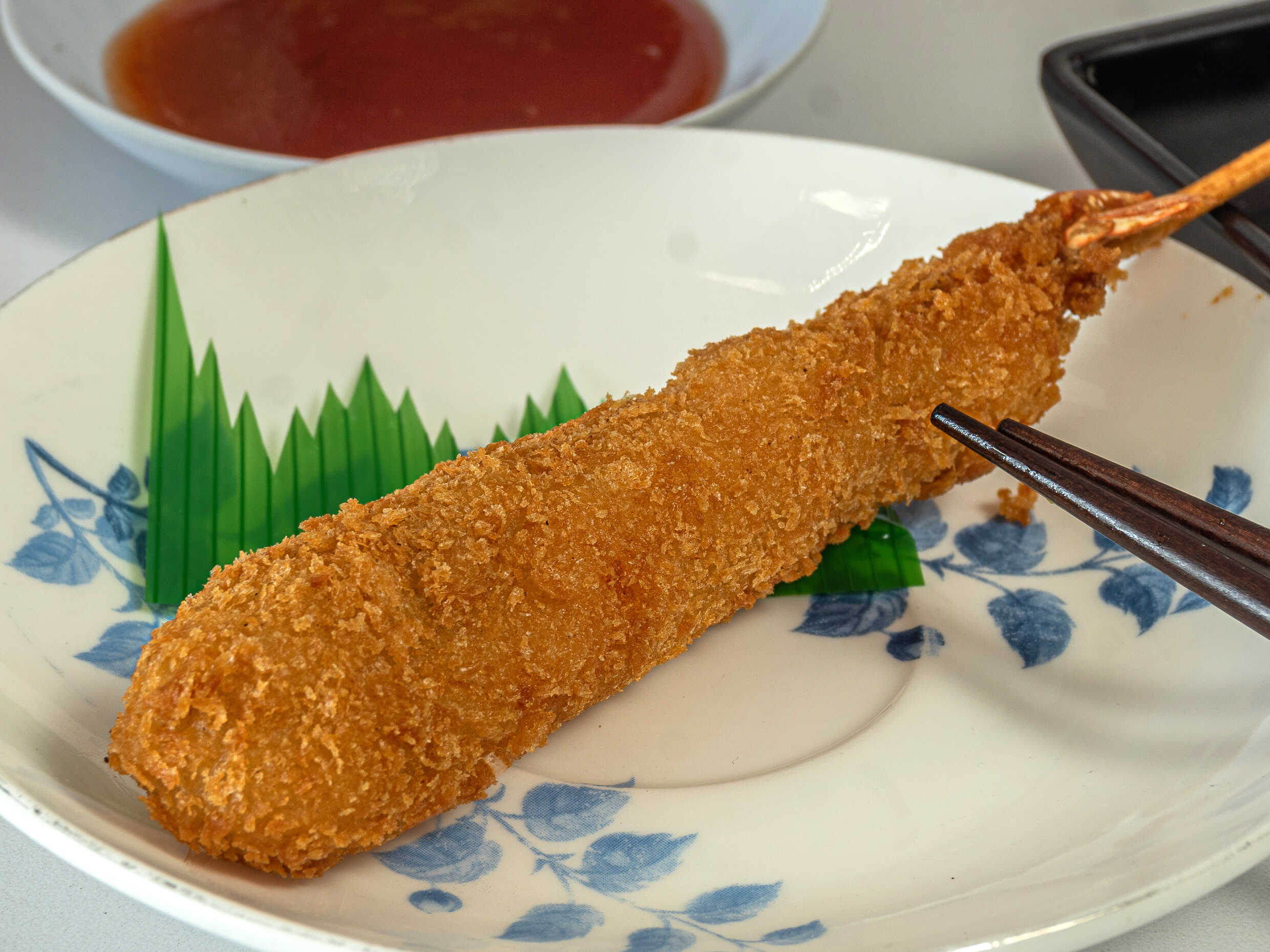 Fideos gruesos en caldo tradicional de soya acompañados de camarones y verduras en tempura.