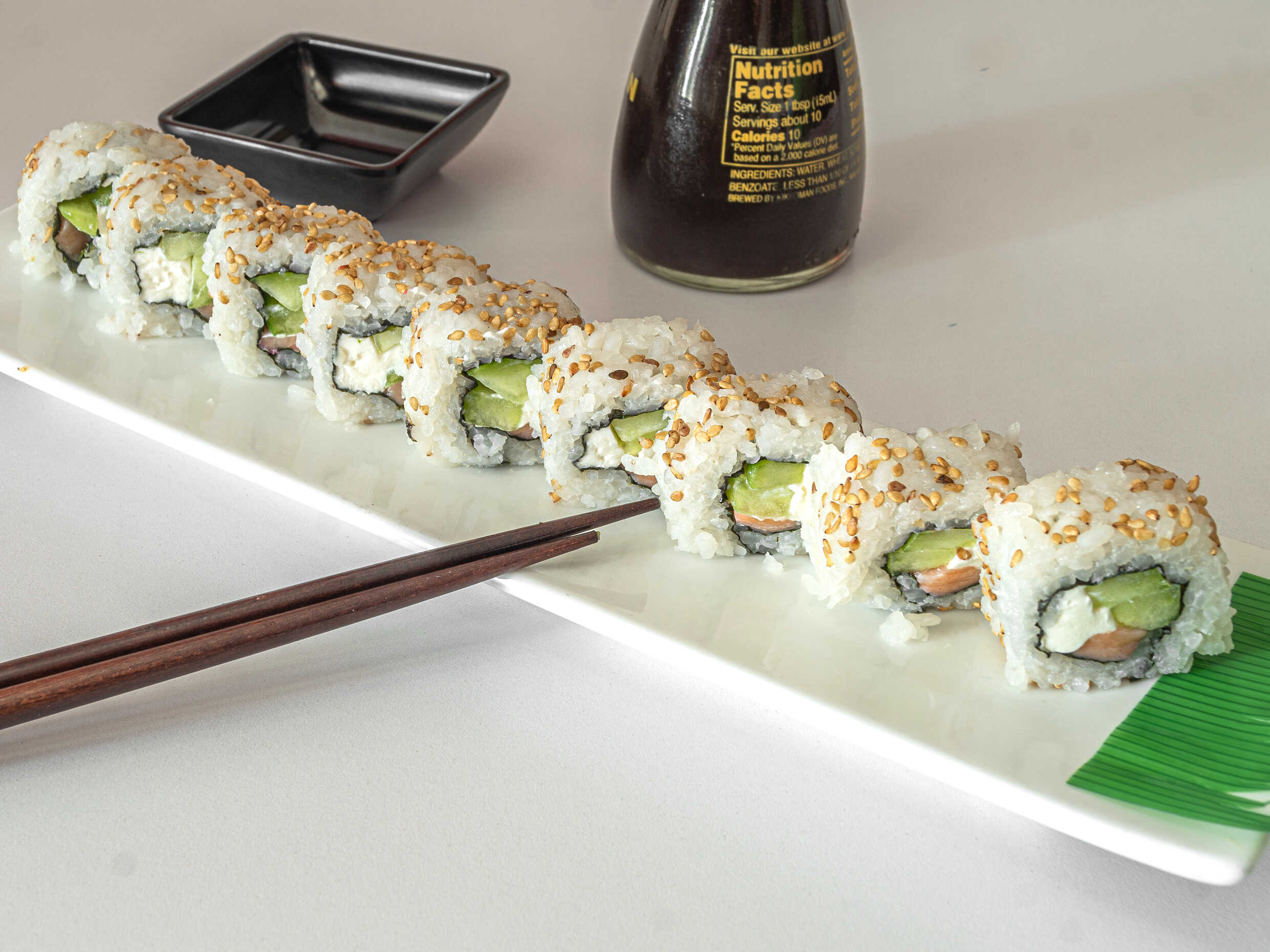 Rollo con salmón ahumado, queso crema, pepino por dentro y ajonjolí por fuera.