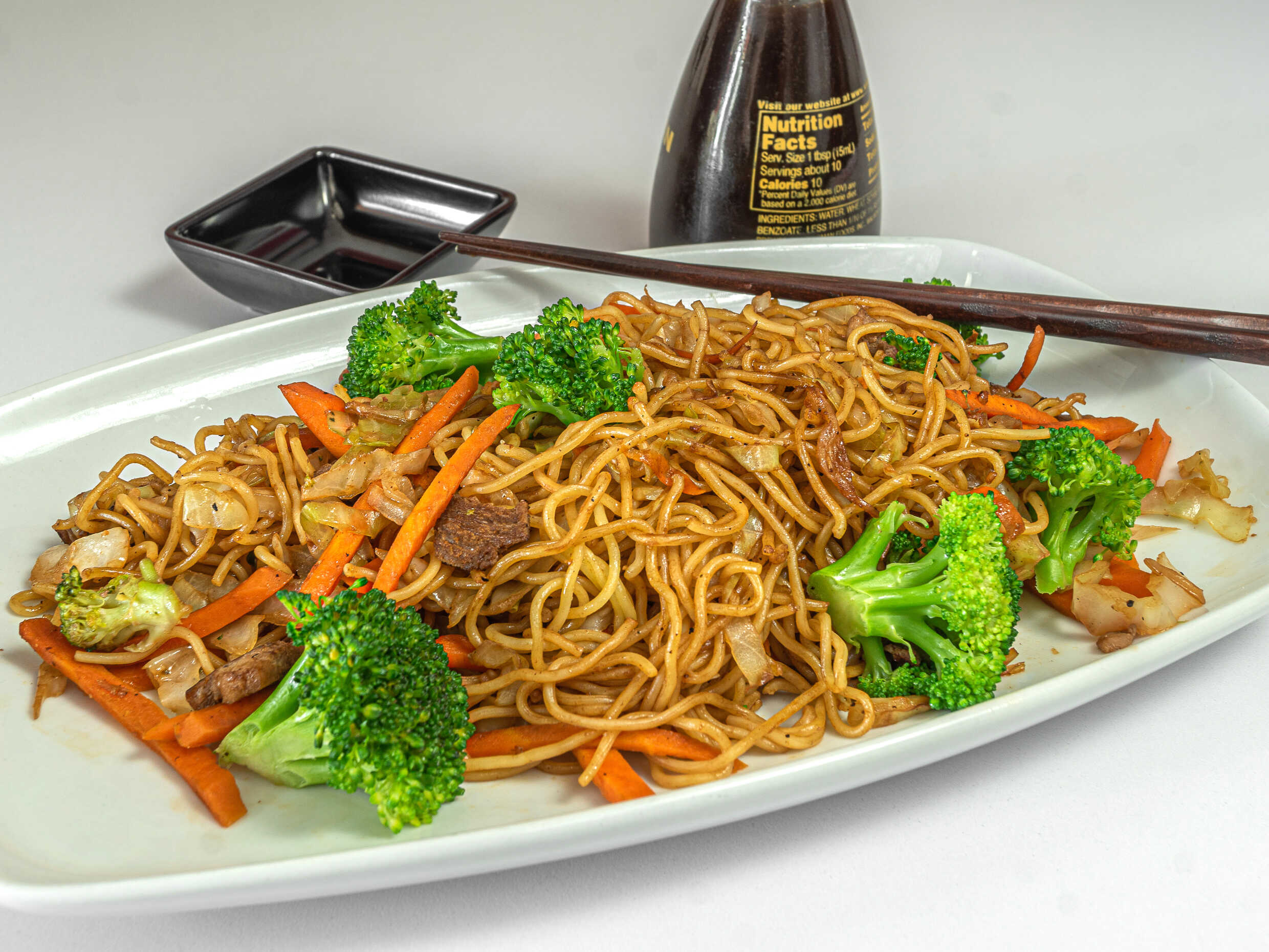 Fideos en salsa especial con trozos de carne de cerdo y verduras mixtas.