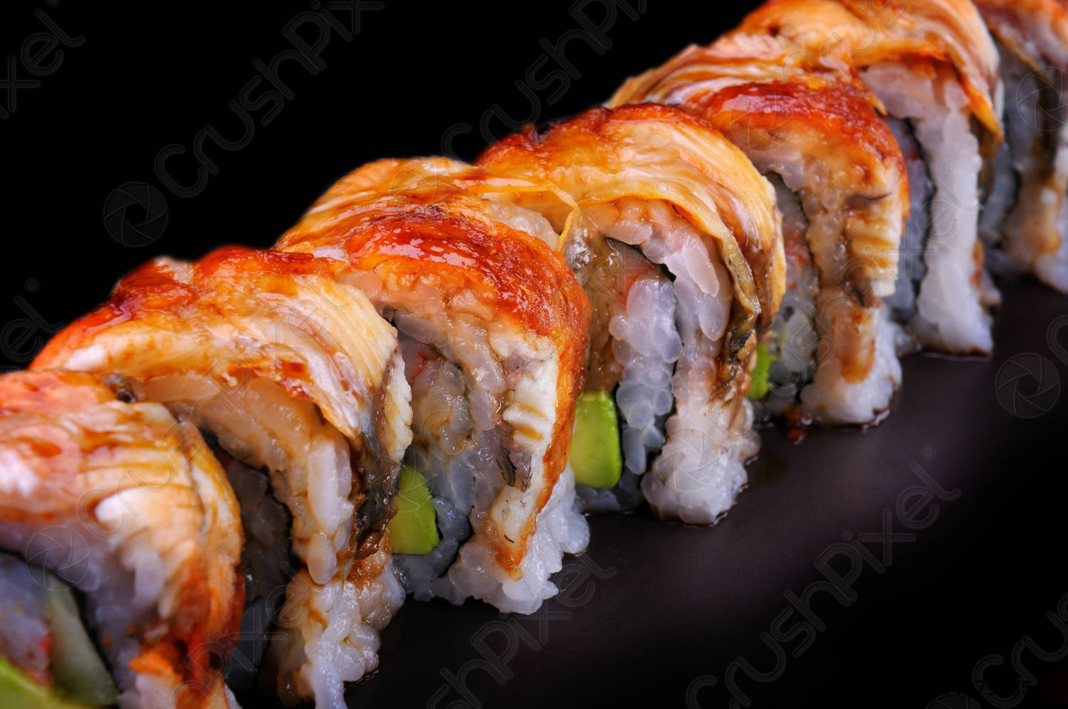 Rollo cubierto de aguacate por fuera y camarón, queso crema, pepino por dentro bañado en salsa dulce.