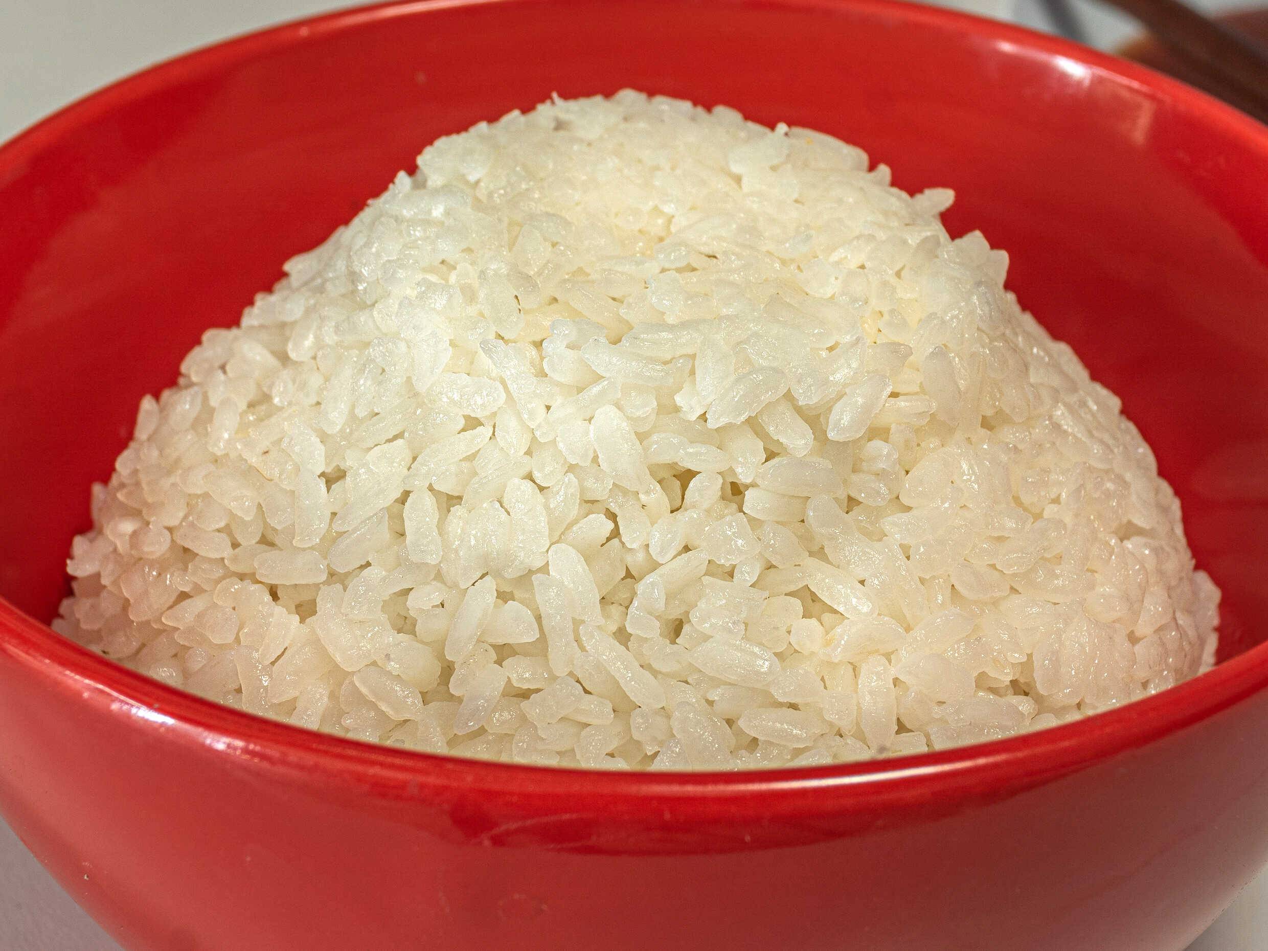 Cubos de pollo marinados en salsa dulce sobre arroz gohan.