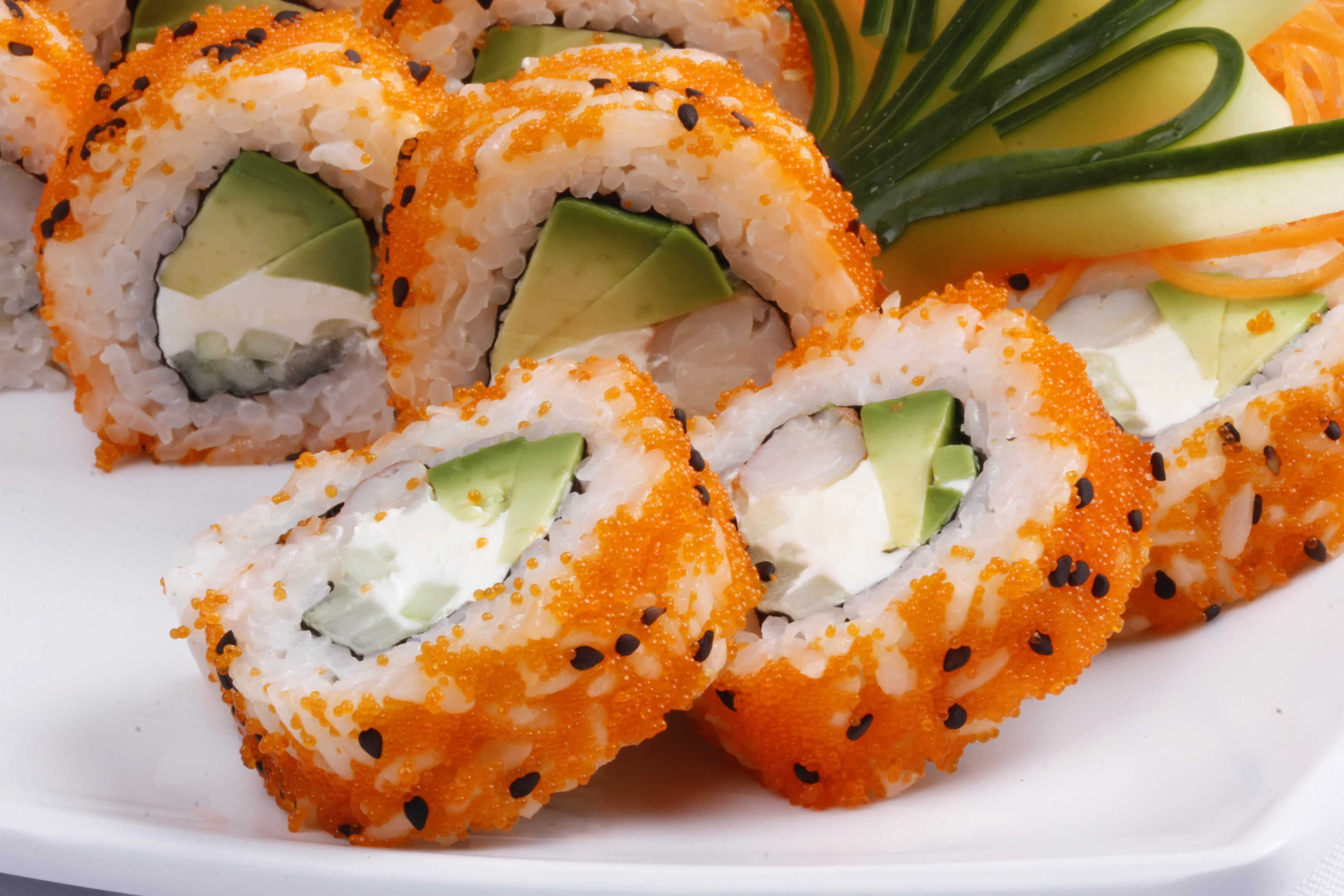 Rollo con masago por fuera y por dentro camarón, aguacate y pepino.