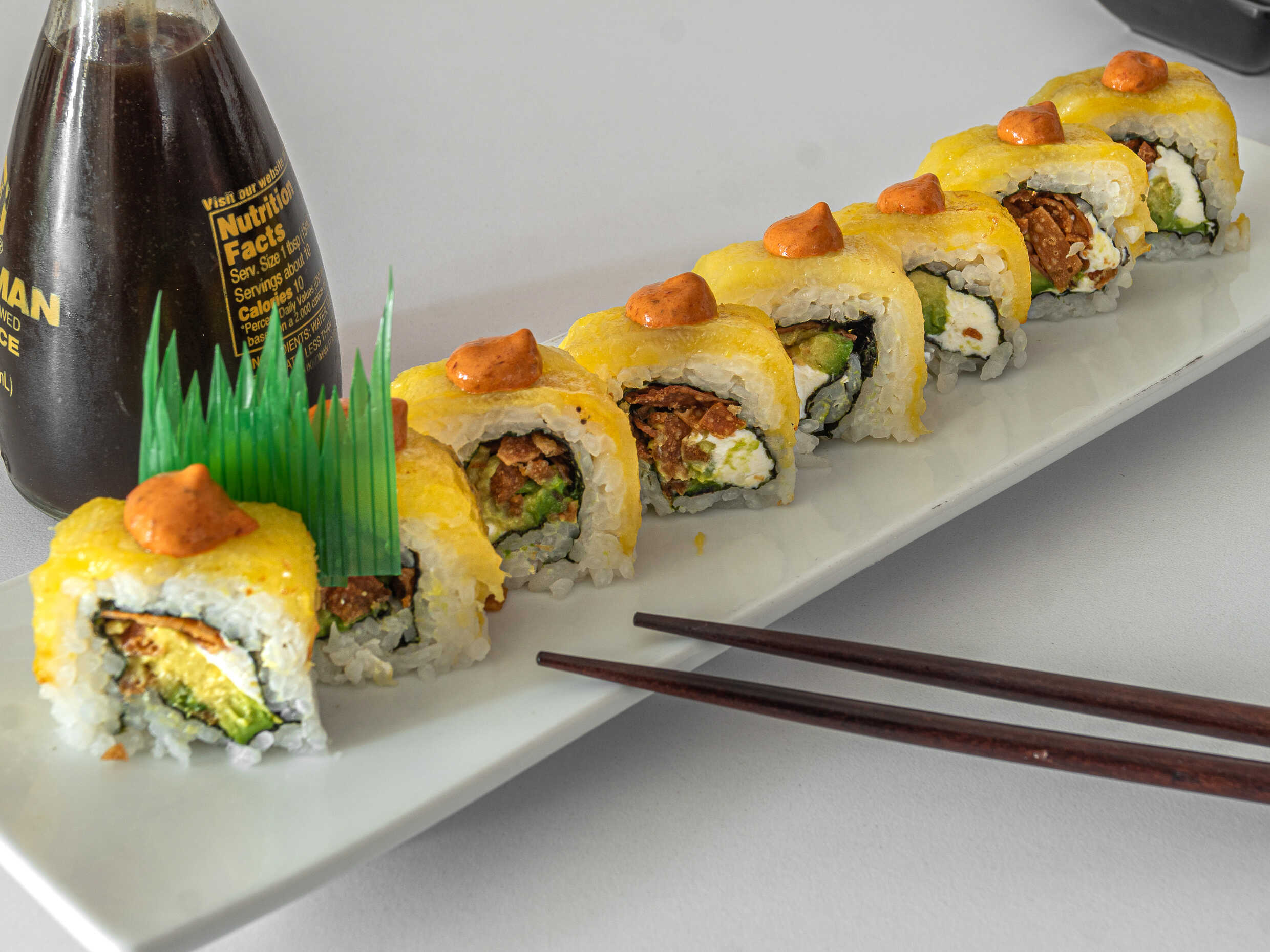 Rollo cubierto de plátano macho frito y queso crema, aguacate, fritura con salsa de chipotle encima.