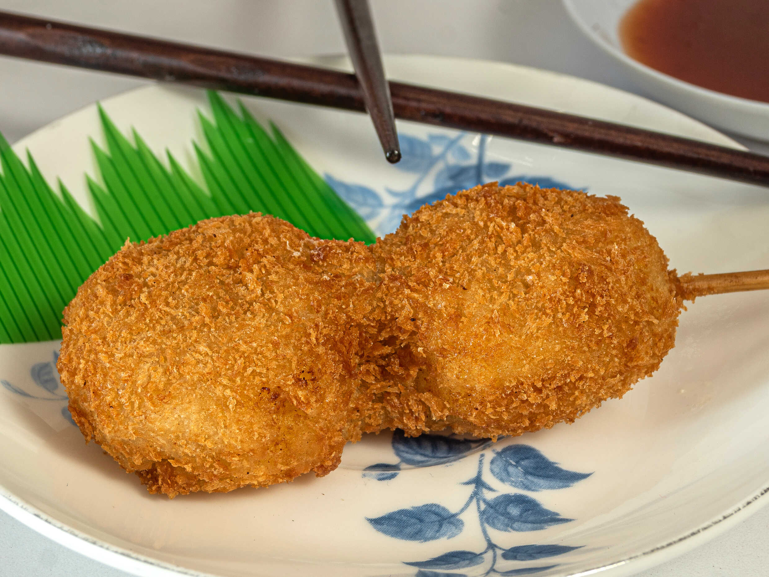 Triángulo de arroz relleno de queso crema empanizado o natural.