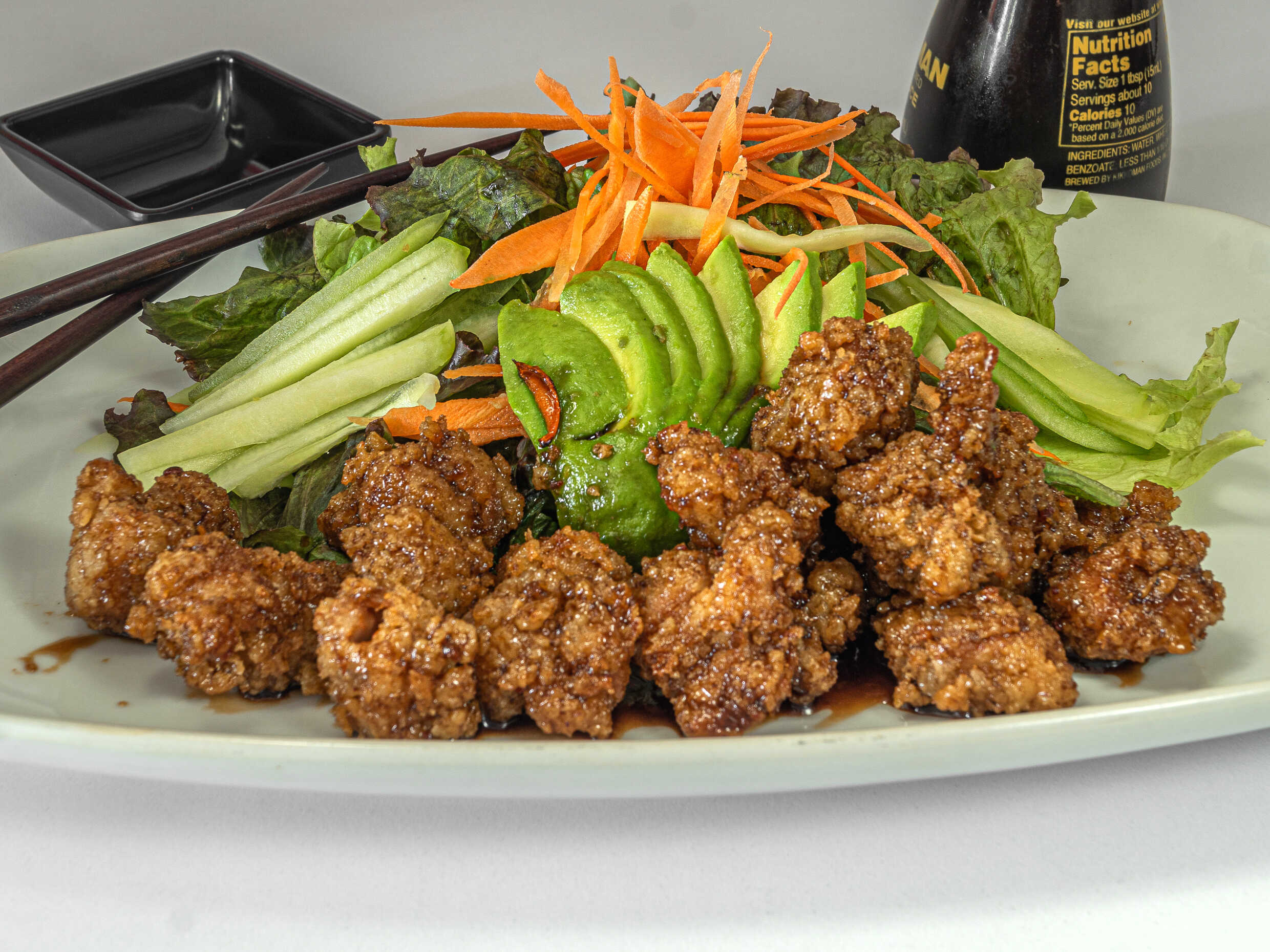 Trocitos de pollo rebozado, fritos y marinados en salsa teriyaki con guarnición de ensalada de verduras frescas.