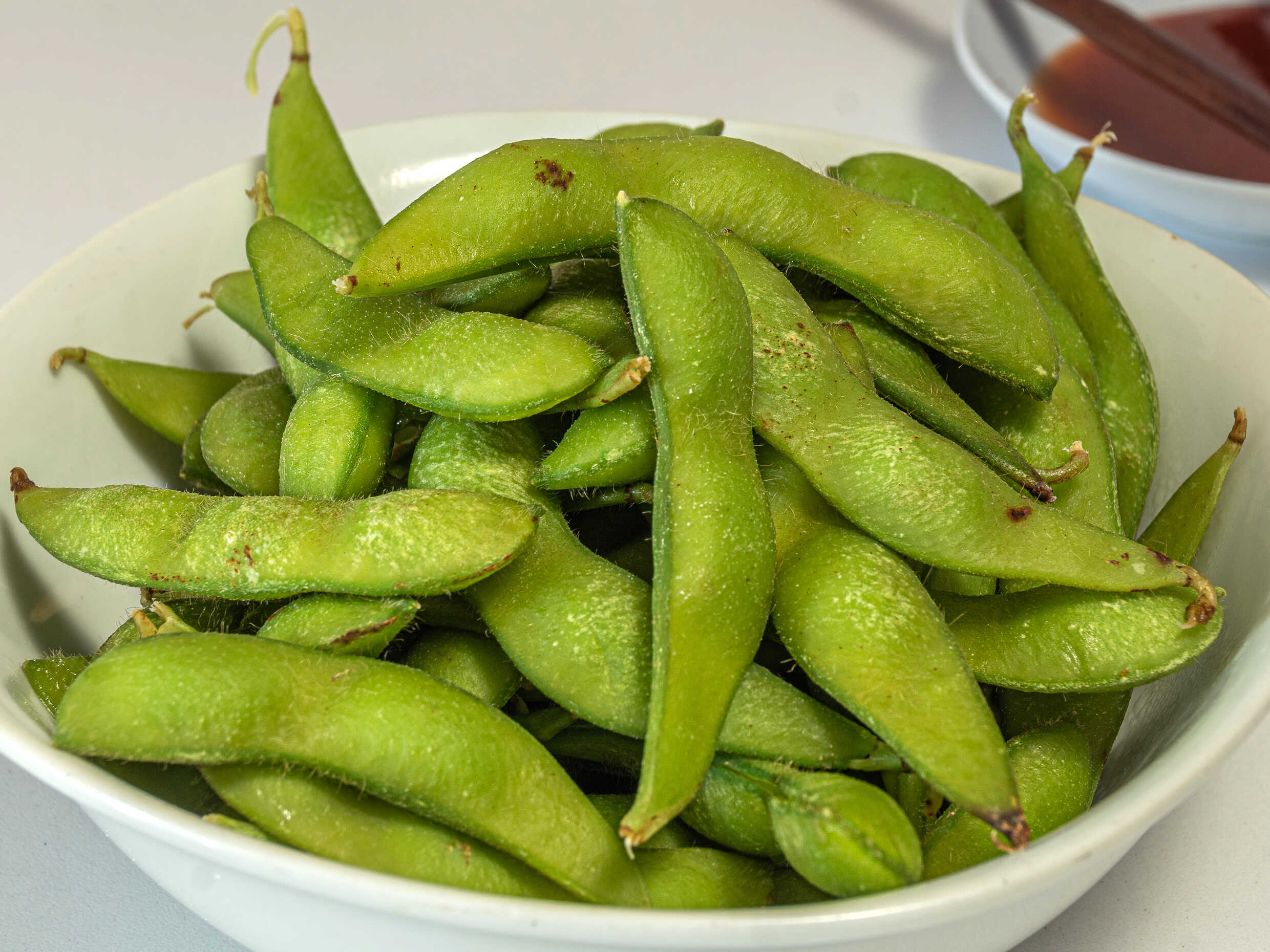 Sopa de frijol de soya con tofu, cebollín y algas marinas.