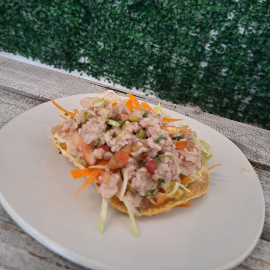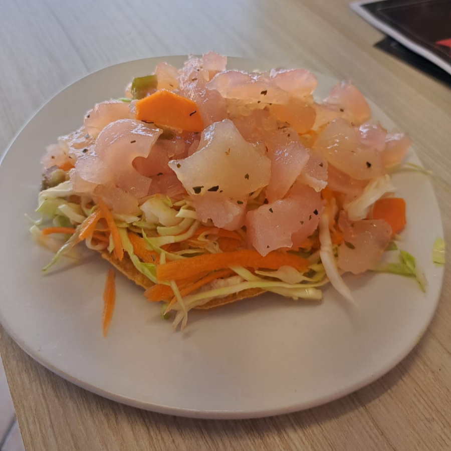 Tostada Aún crudo (Atún sobre cama de Col, zanahoria y jícama)