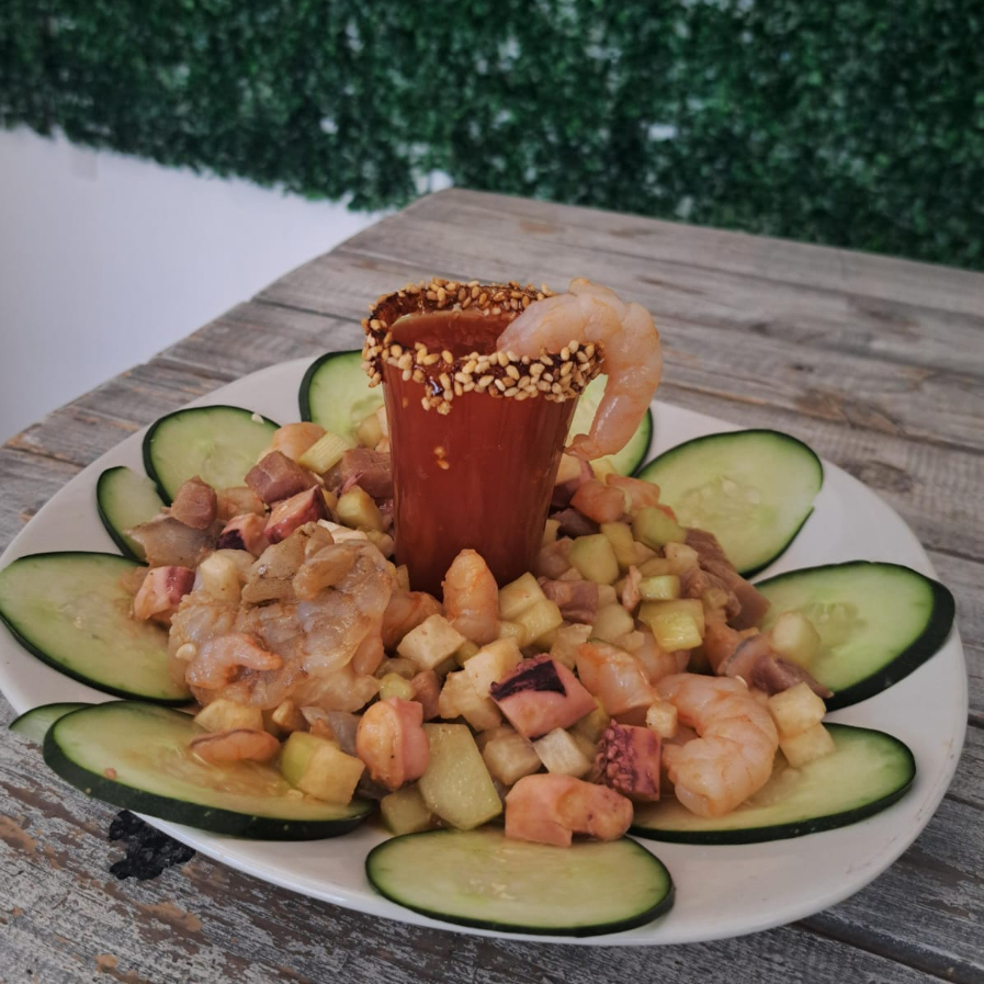 Especialidad de la casa ( camarón cocido, camarón crudo, pulpo, atún crudo, pepino, jicama, cebolla + shot de clamato con ostion)