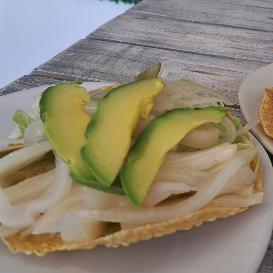Tostada de viril ( viril sobre cama de col, zanahoria y jícama)
