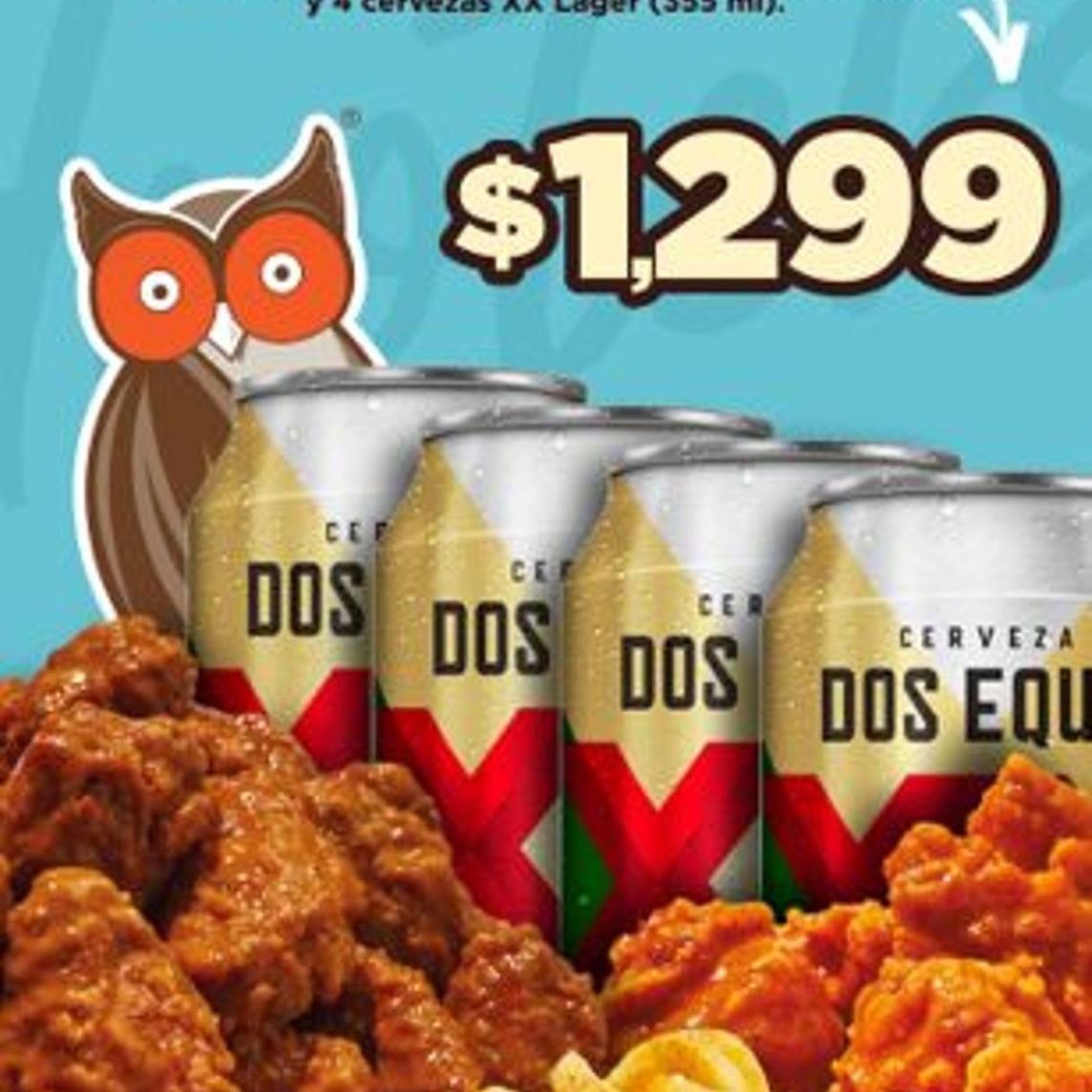 Incluye: 2 órdenes de papa curly (680 g), 20 pzas Boneless (560 g), 20 pzas Wings (1,060 g) bañados con tu Wing Sauce favorita con el aderezo de tú elección y 4 cervezas XX Lager (355 ml). ¡Sólo este fin de semana recibe 2 cervezas adicionales GRATIS!