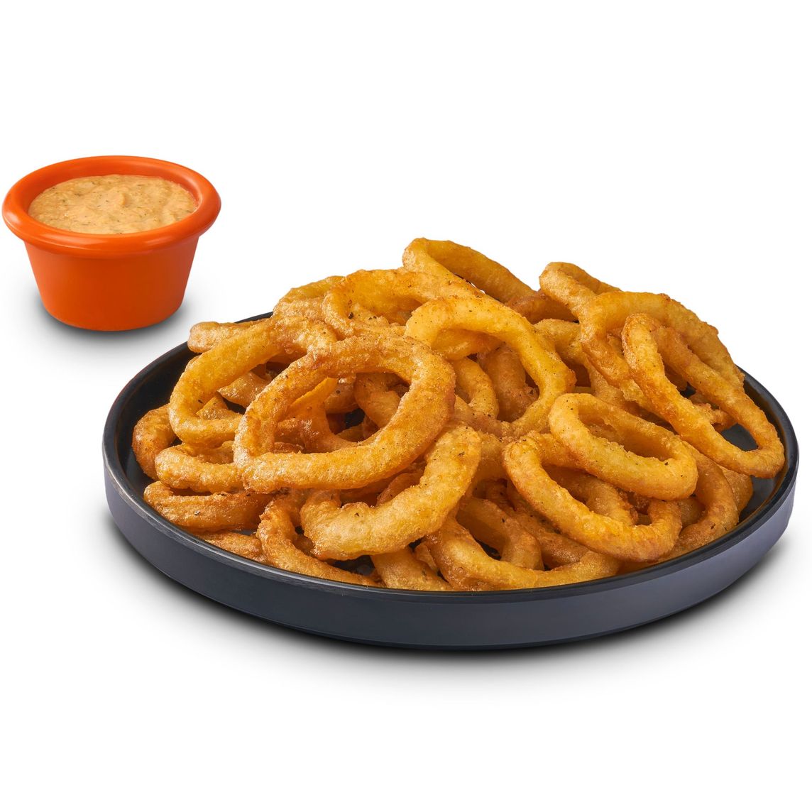 Aros de cebolla rebozados, acompañados de aderezo cremoso Remoulade. ¡Perfectos para compartir (225 g)!