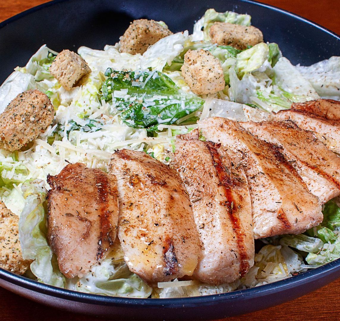 Tiras de pechuga de pollo (120 g) a la plancha, lechuga orejona fresca mezclada con aderezo Caesar, croutones y queso parmesano espolvoreado