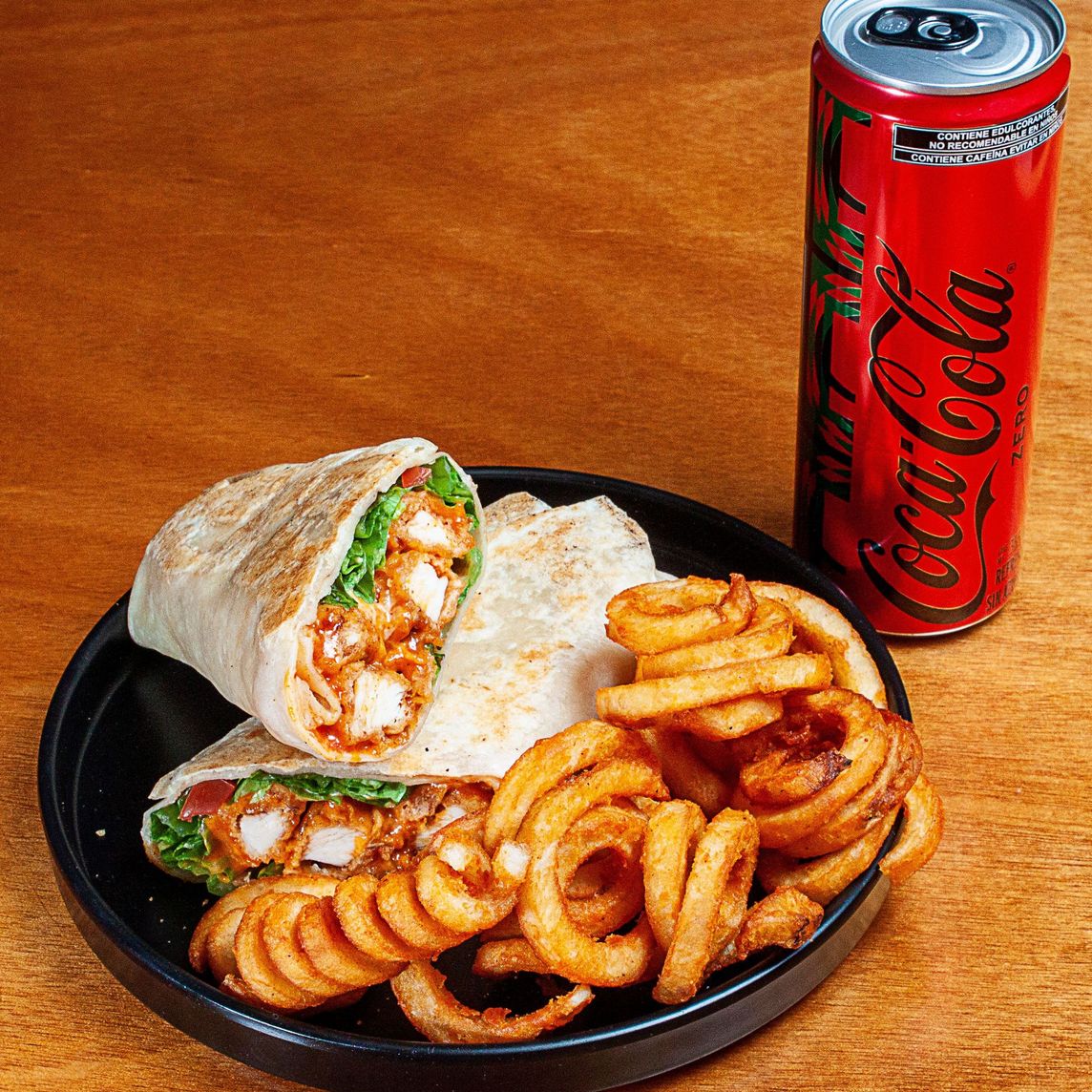 Boneless Wings Buffalo (140 g), bañados con tu Wing Sauce favorita. Servidos en tortilla de harina con lechuga, jitomate y aderezo Ranch. Incluye papas (100 g). Incluye un refresco de lata de la familia Coca-Cola de 355 ml,
