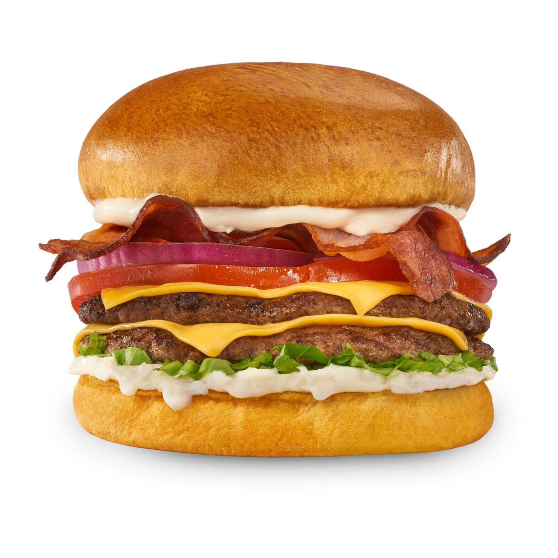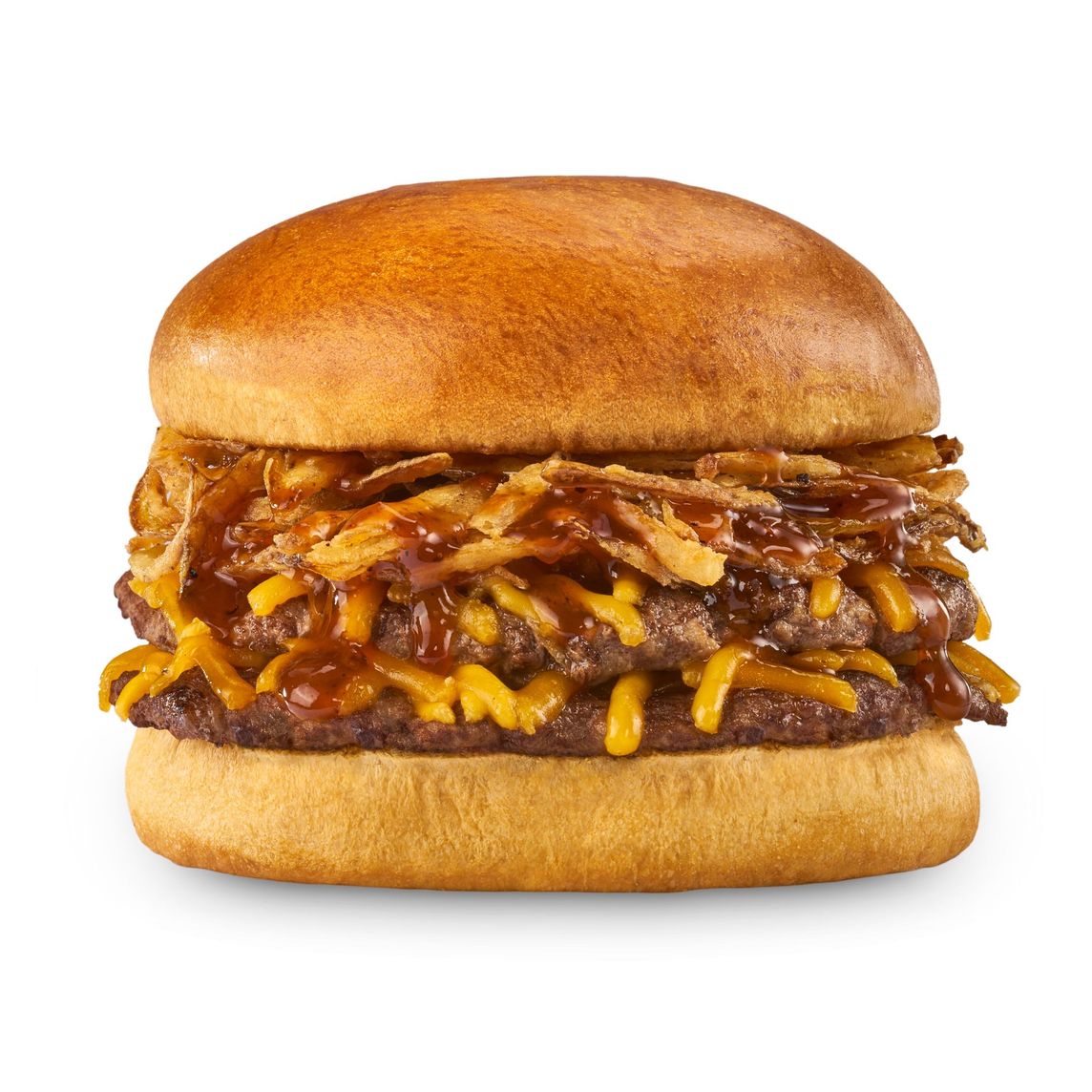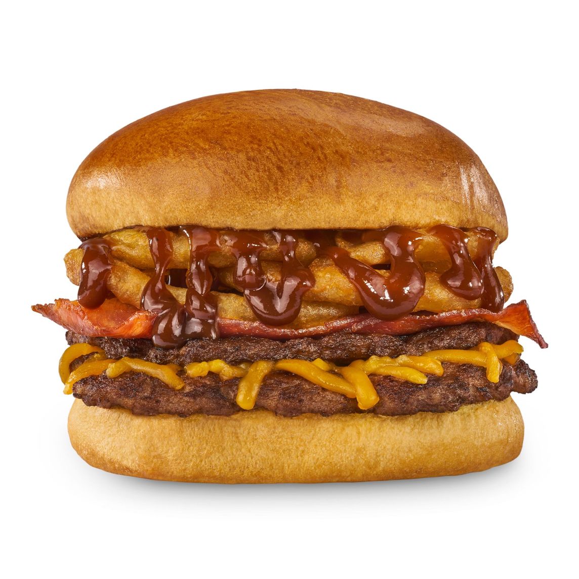 Hamburguesa con carne de res a la plancha (150 g), queso Cheddar gratinado, tiras de tocino, aros de cebolla y salsa BBQ. Incluye papas.