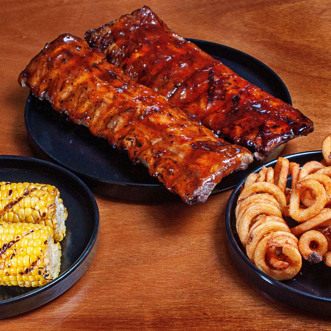 Costillas de cerdo marinadas y horneadas (500 g). Caramelizadas en la parrilla con tu salsa favorita. Acompañadas con elote a la parrilla y papa curly (100g).