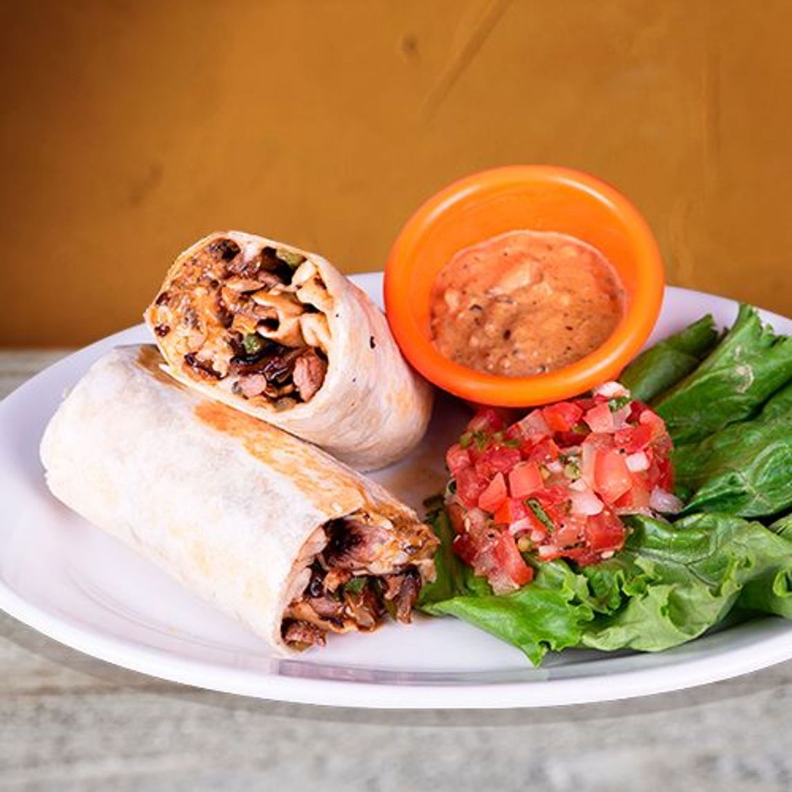 Burrito de tortilla de harina con arrachera (90 g) y camarones (30 g), champiñones, cebolla y pimientos salteados, queso Monterey Jack y aderezo Remoulade.