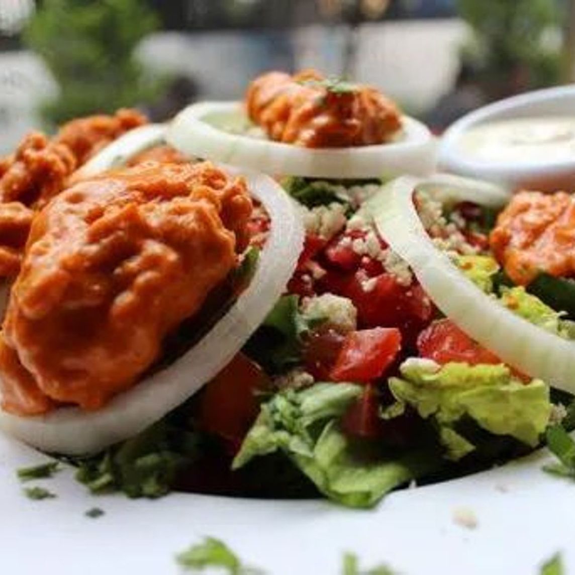 Pechuga de pollo (140g) estilo Buffalo, bañada con tu Wing Sauce favorita, aderezo Ranch, ensalada campestre, jitomate, queso azul y aros de cebolla