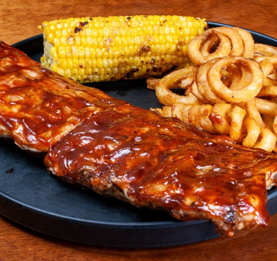 Costillas de cerdo marinadas y horneadas (250 g). Caramelizadas en la parrilla con tu salsa favorita. Acompañadas con elote a la parrilla y papa curly.