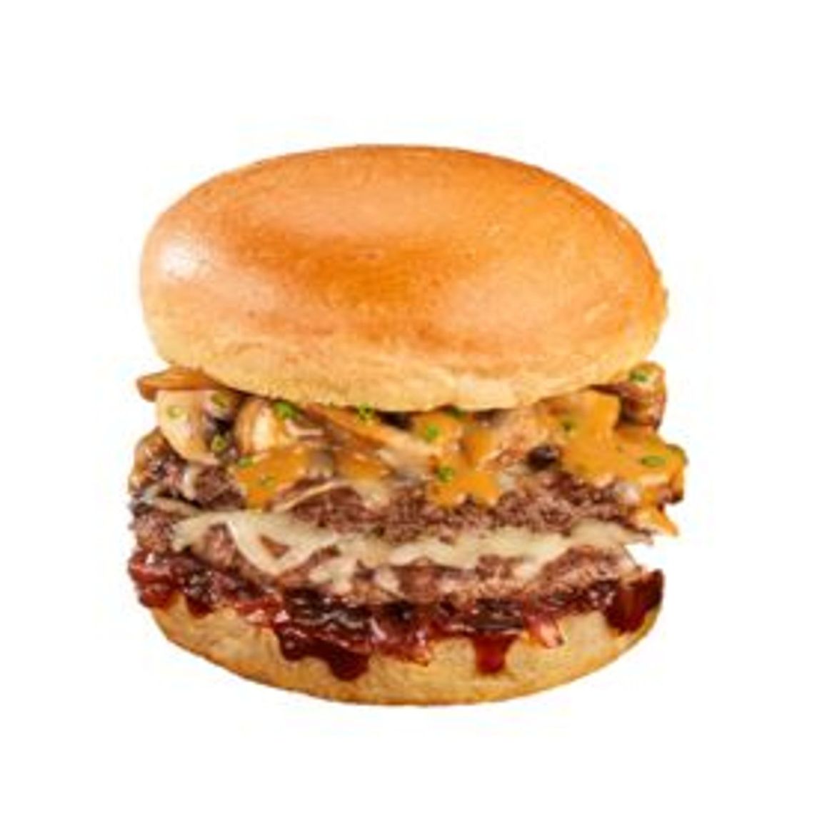 Hamburguesa de res (150), a la plancha con queso monterey jack, cebolla caramelizada con salsa Beer & Cheese, y champiñones salteados.