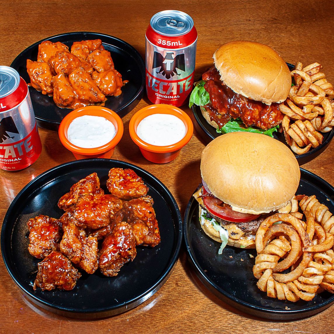 Incluye: 1 Original Buffalo Chicken Sandwich, 1 Classic Burger, 20 pzas Boneless, bañados con tu Wing Sauce favorita con el aderezo de tú elección y 2 cervezas (355 ml).