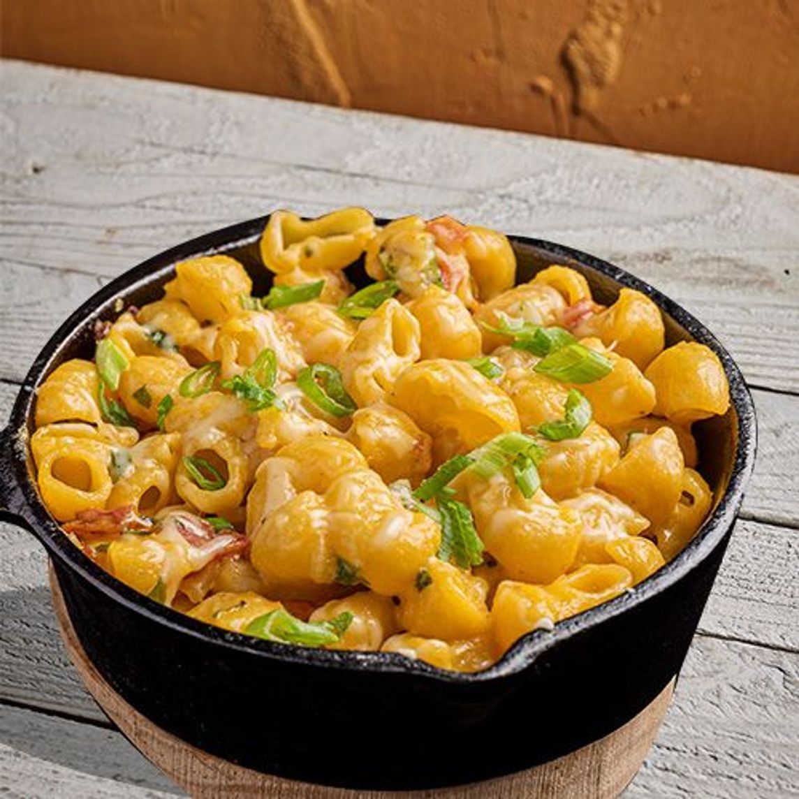 Macarones (200 g) bañados con cremosa salsa de queso Cheddar, gratinados al horno con queso Parmesano, tocino y un toque de cebollín.