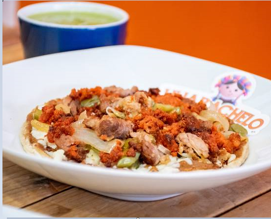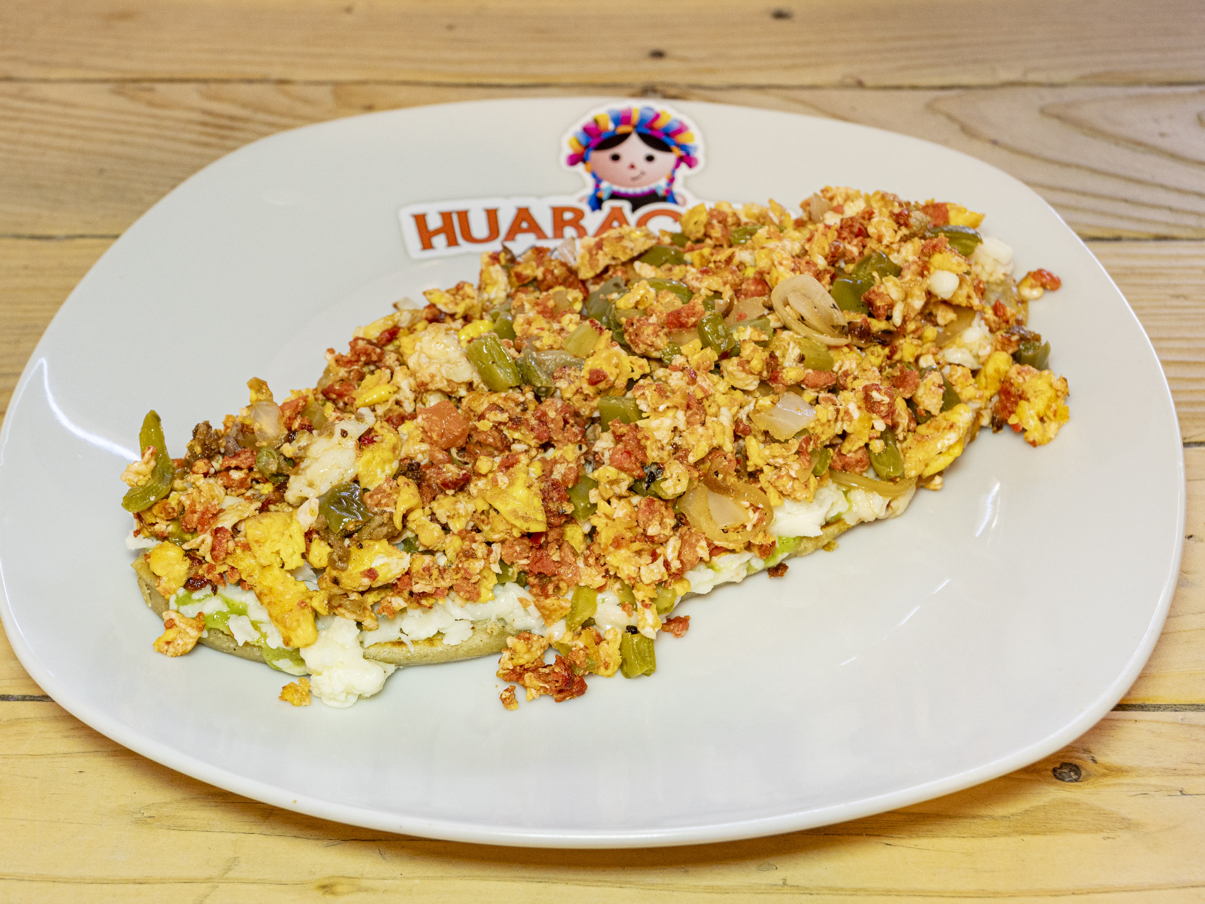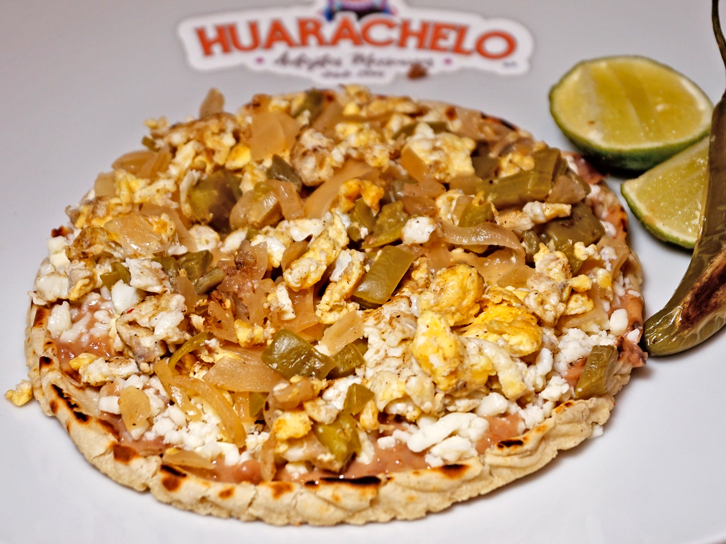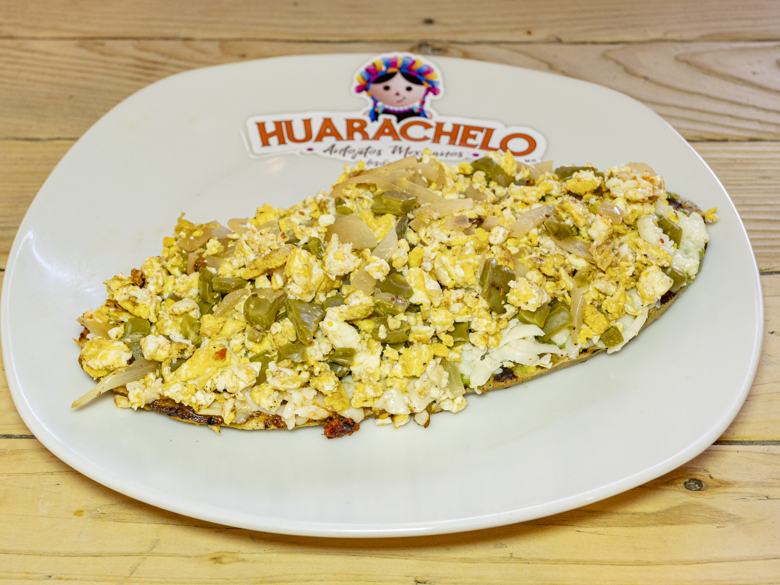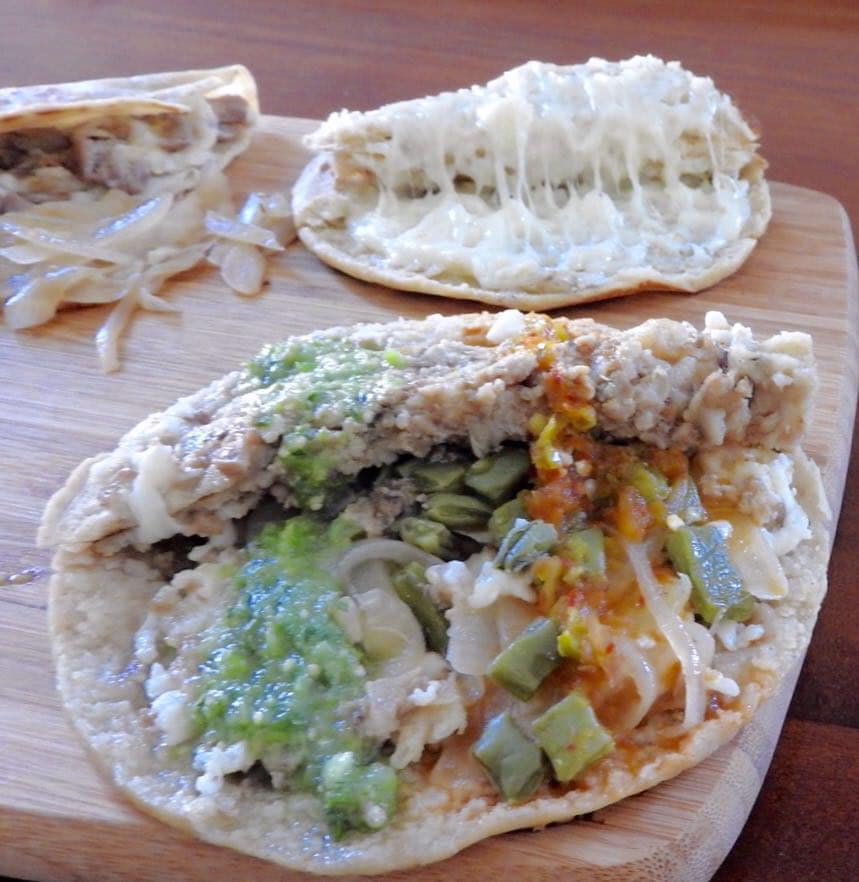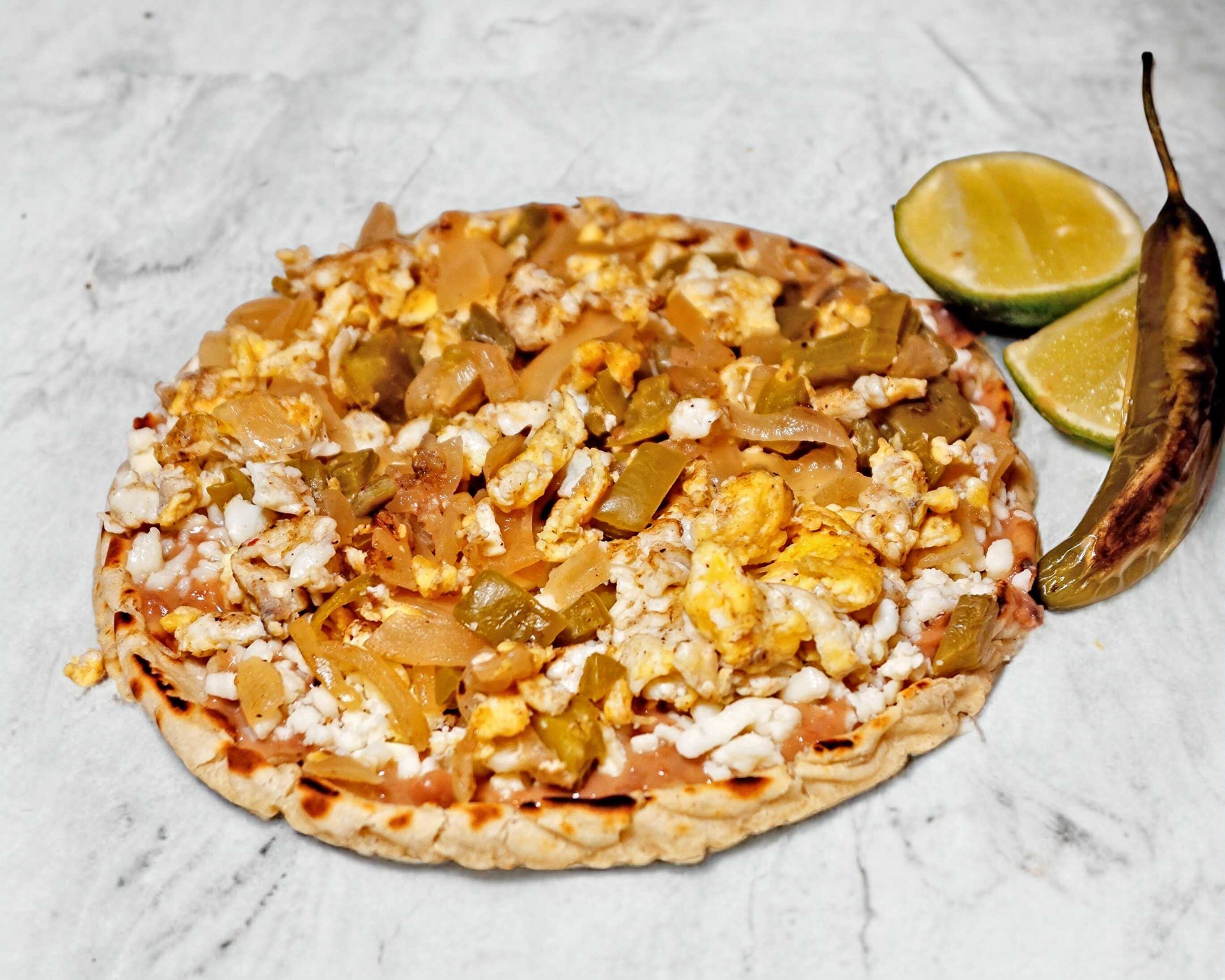 Tortilla de masa alargada, cocida en comal, rellena de deliciosos frijoles refritos con la receta secreta de Doña Consuelo, con una capa de salsa roja o verde de auténtico guacamole, queso asadero oaxaca y delicioso huevo revuelto con nopales asados y cebolla asada o cruda.