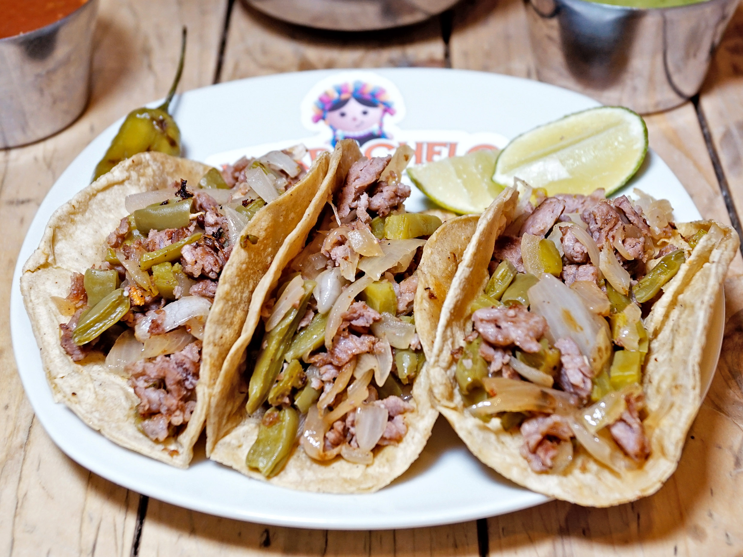 3 Tortillas con 90 grs chorizo ranchero, cebollita y nopal asado