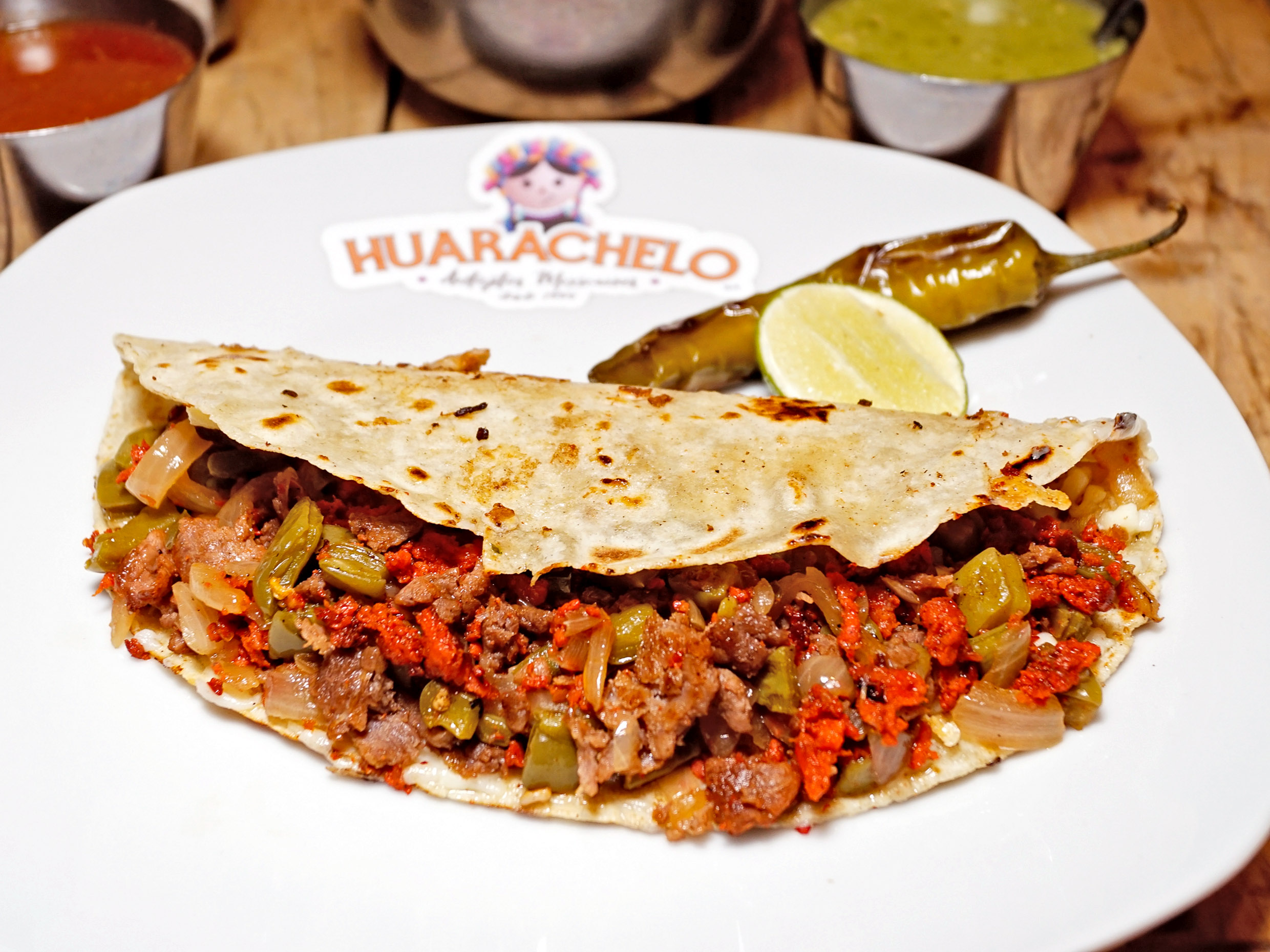 Tortilla de masa alargada, cocida en comal, rellena de deliciosos frijoles refritos con la receta secreta de Doña Consuelo con una capa de salsa roja o verde de auténtico guacamole, exquisito queso asadero oaxaca, con nuestro delicioso bistec de res de SuKarne acompañado de nopales asados y cebolla.