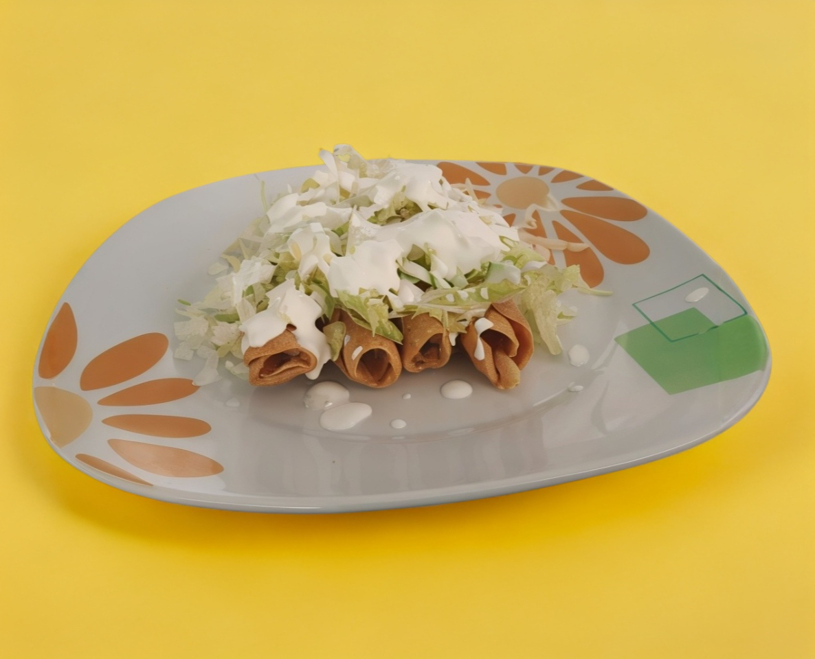 Orden con 4 tacos dorados rellenos de pollo con lechuga, crema, cebolla y salsa.