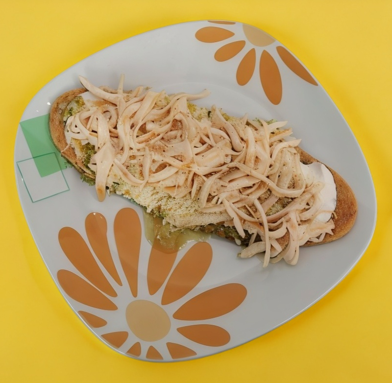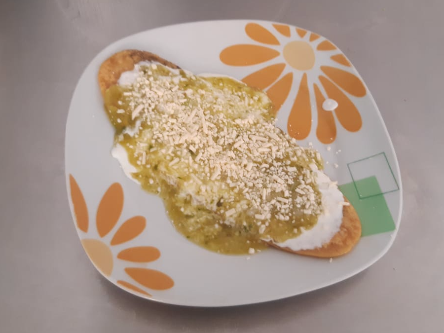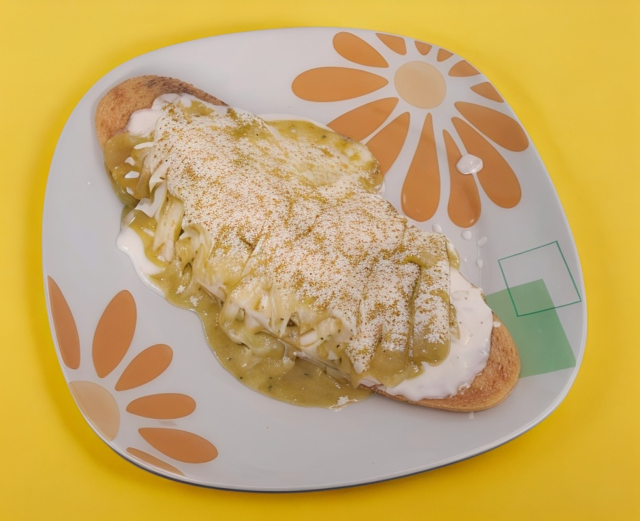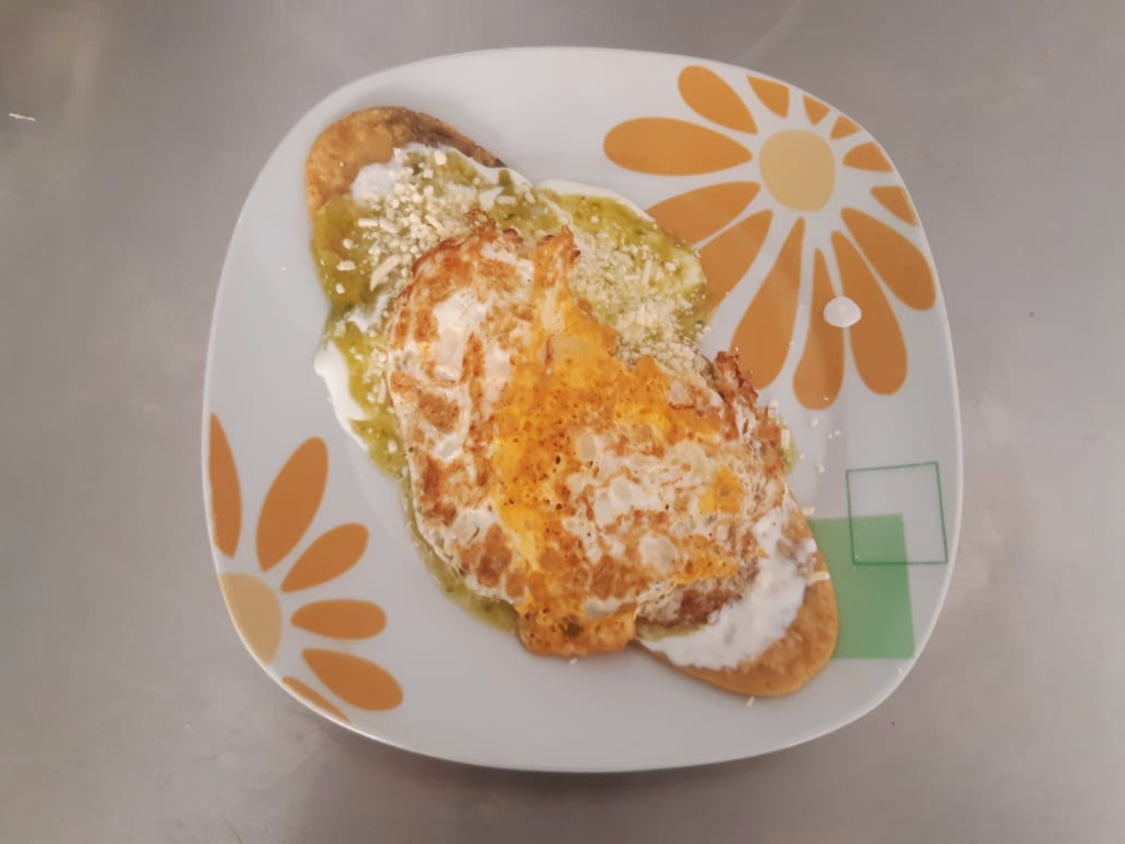 Huarache de tortilla rellena de frijoles, se sirve con crema, salsa (verde o roja), cebolla y queso con huevo a elección (revuelto o estrellado).