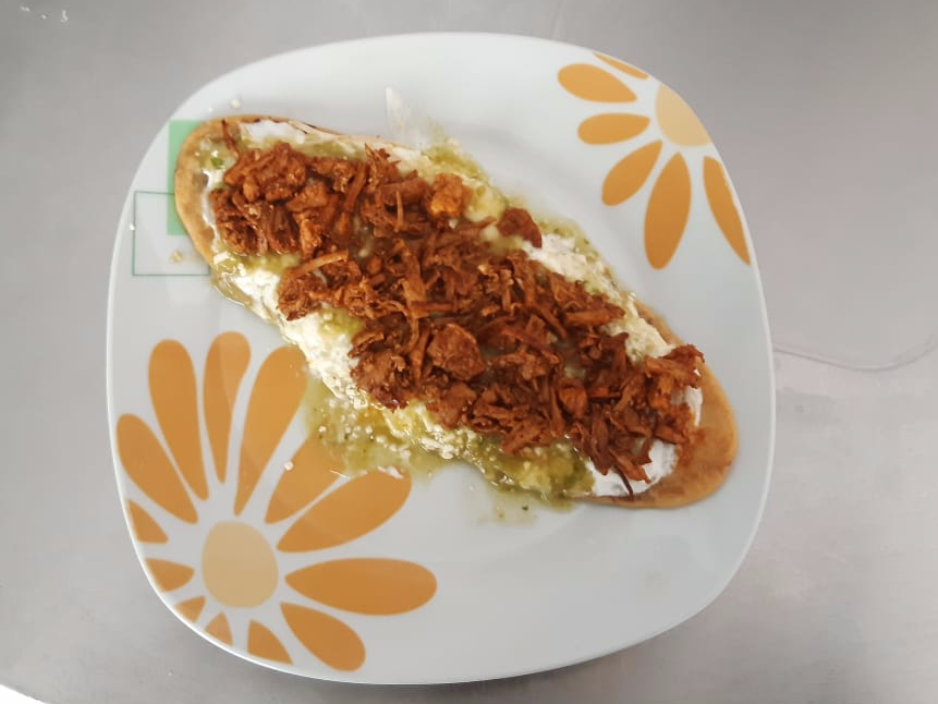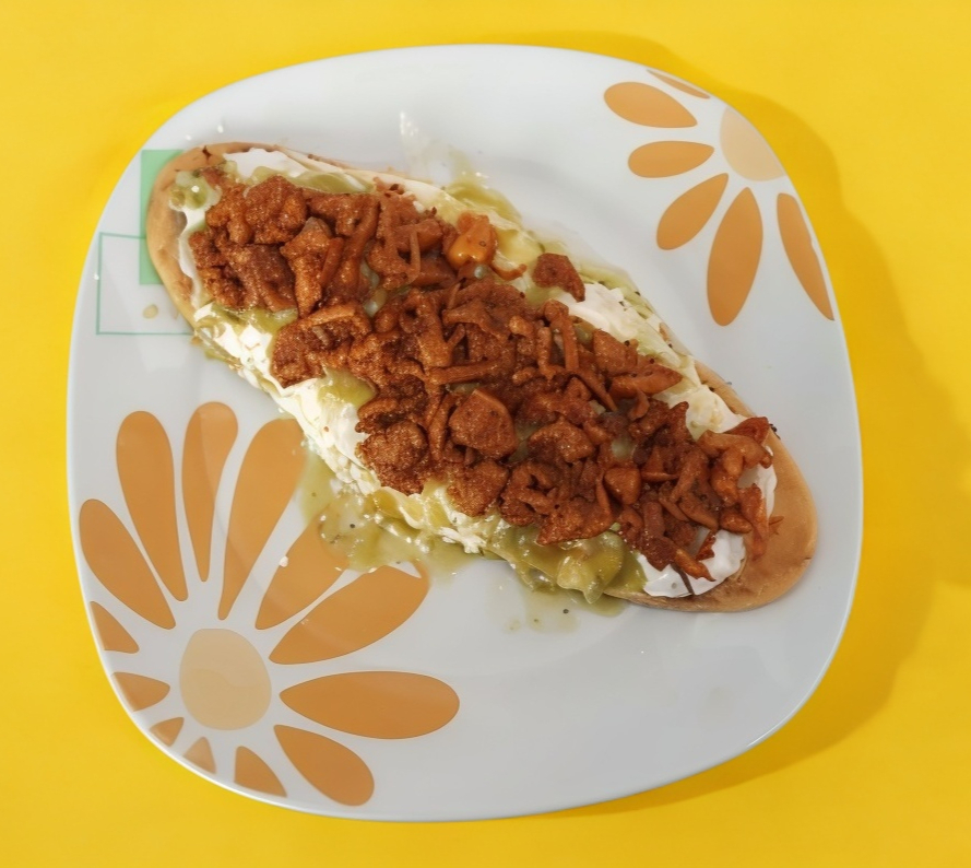 Huarache de tortilla rellena de frijoles, se sirve con crema, salsa (verde o roja), cebolla y queso con chilorio.