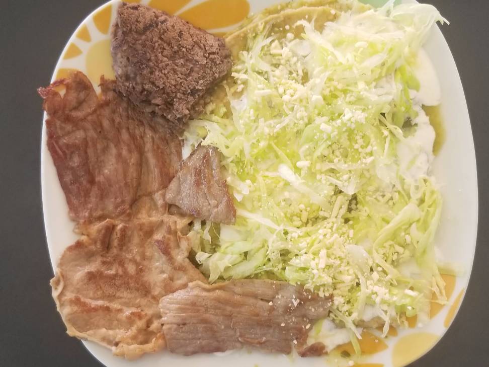 Huarache de tortilla rellena de frijoles, se sirve con crema, salsa (verde o roja), cebolla y queso con bistec de res asado.