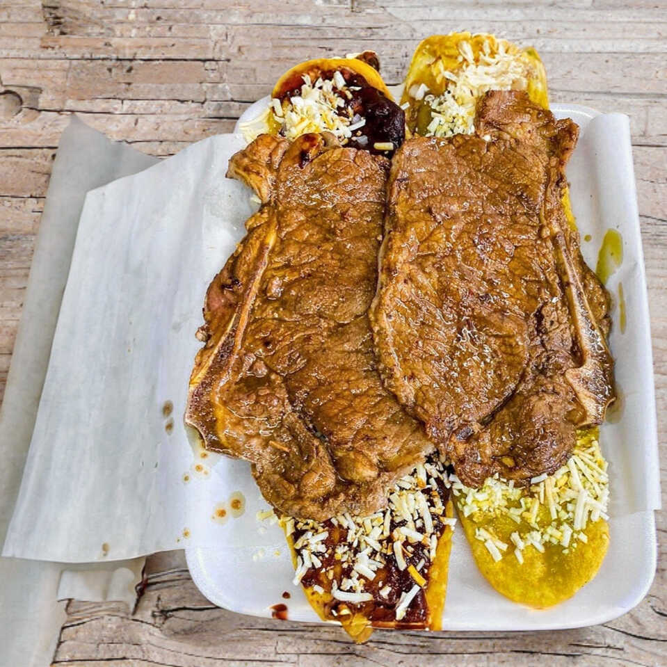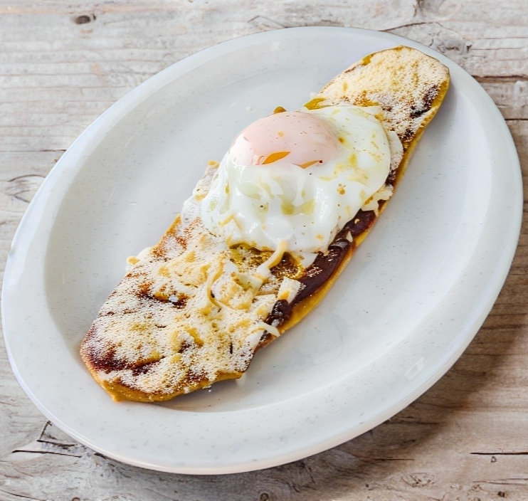 Hecho con masa de maíz y relleno de frijoles, servido con queso, cebolla y salsa de tu preferencia, acompañado de carne de bistec de res y un huevo.