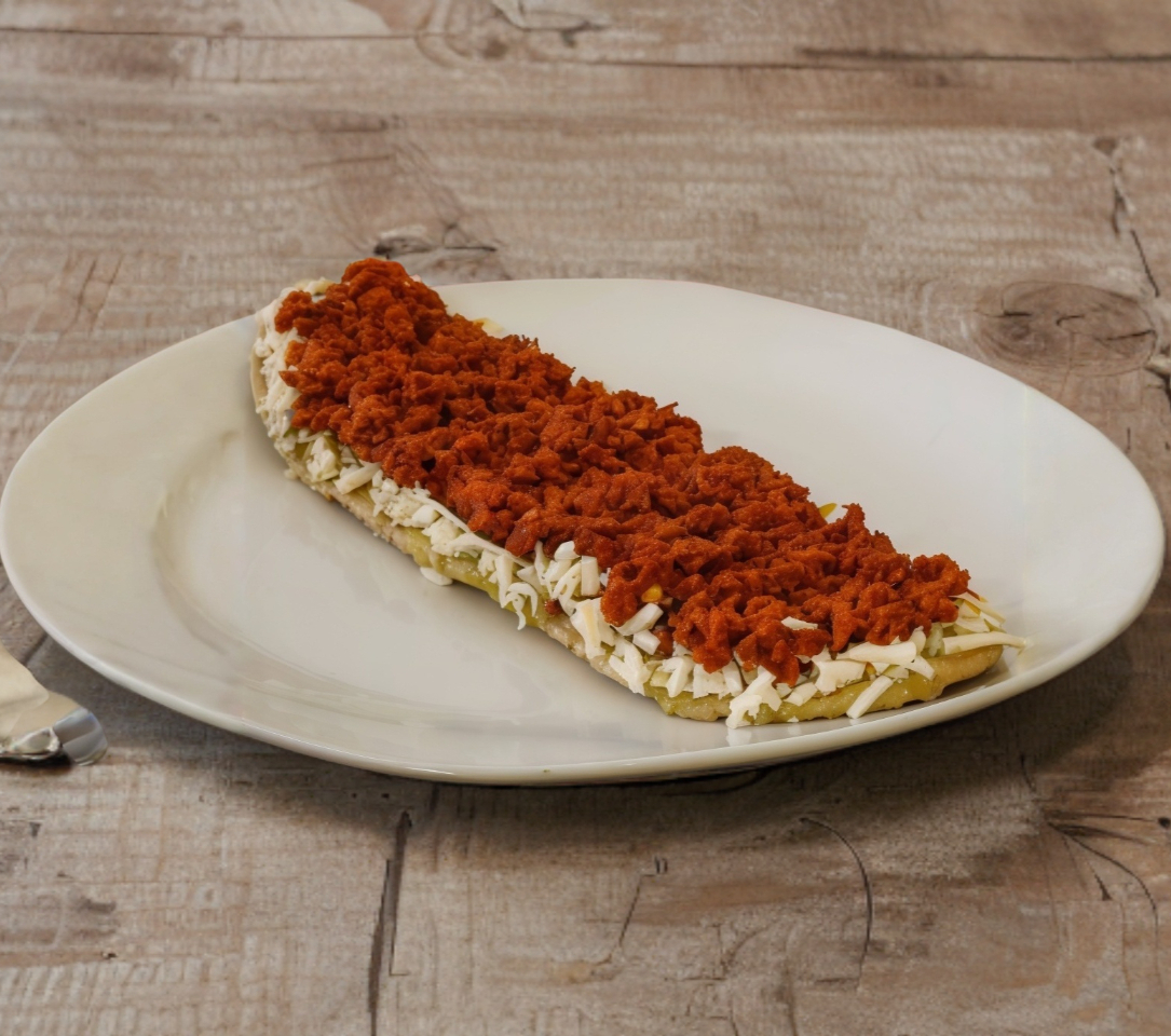 Hecho con masa de maíz y relleno de frijoles, servido con queso, cebolla, salsa de tu preferencia y una rica costra de queso Oaxaca