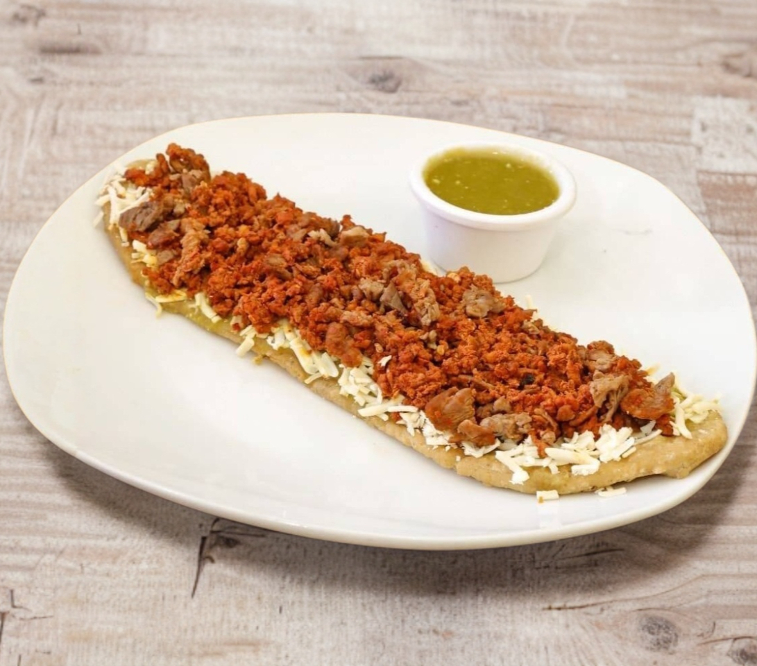 Hecho con masa de maíz y relleno de frijoles, servido con queso, cebolla y salsa de tu preferencia, acompañado de carne de bistec y pastor