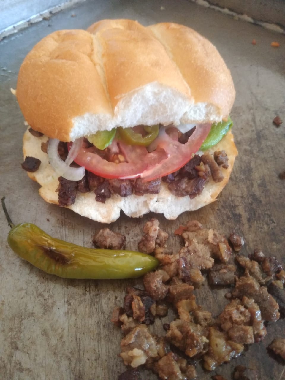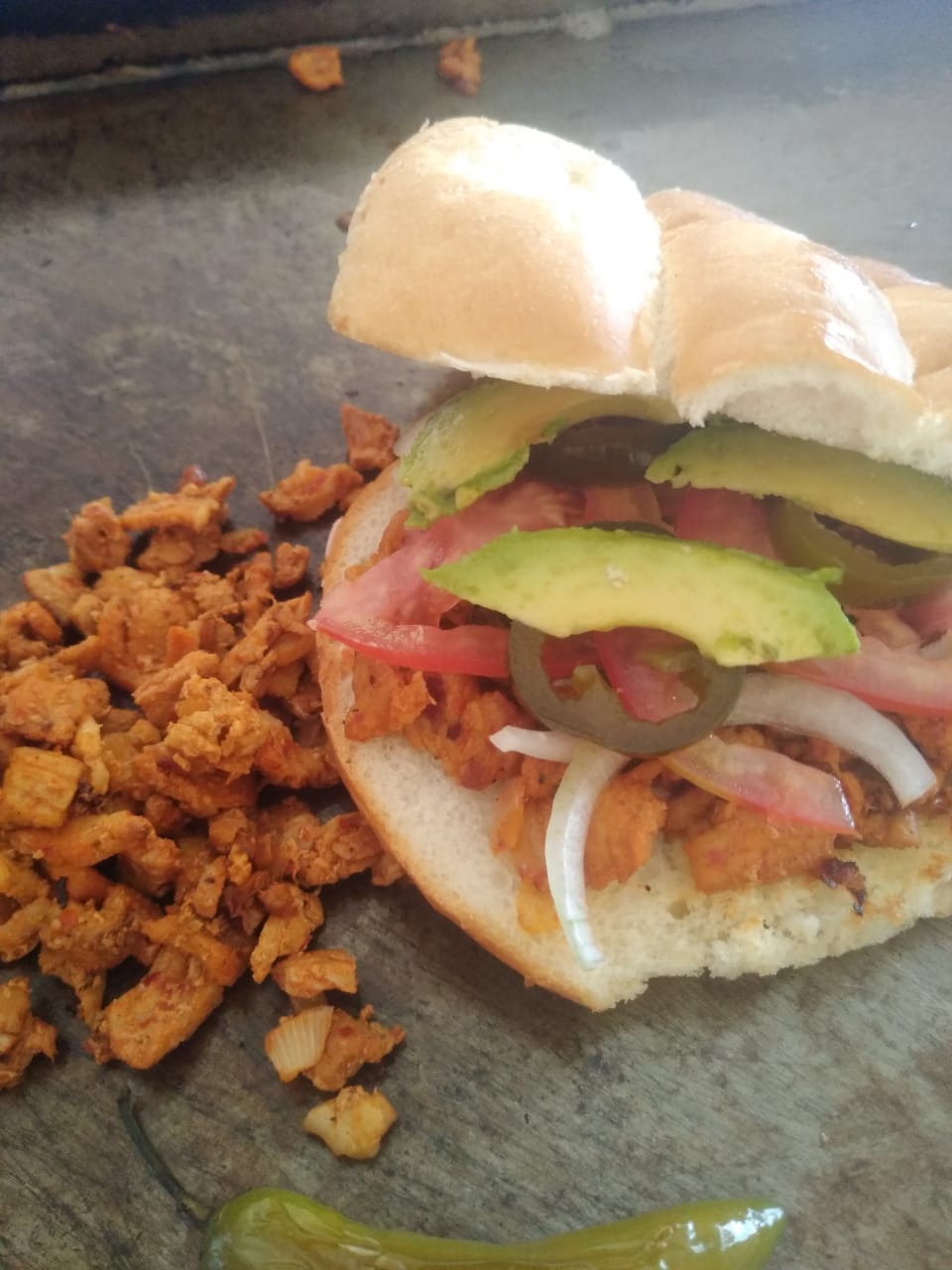 Bistec adobado, jitomate, cebolla, chiles en vinagre y aguacate.