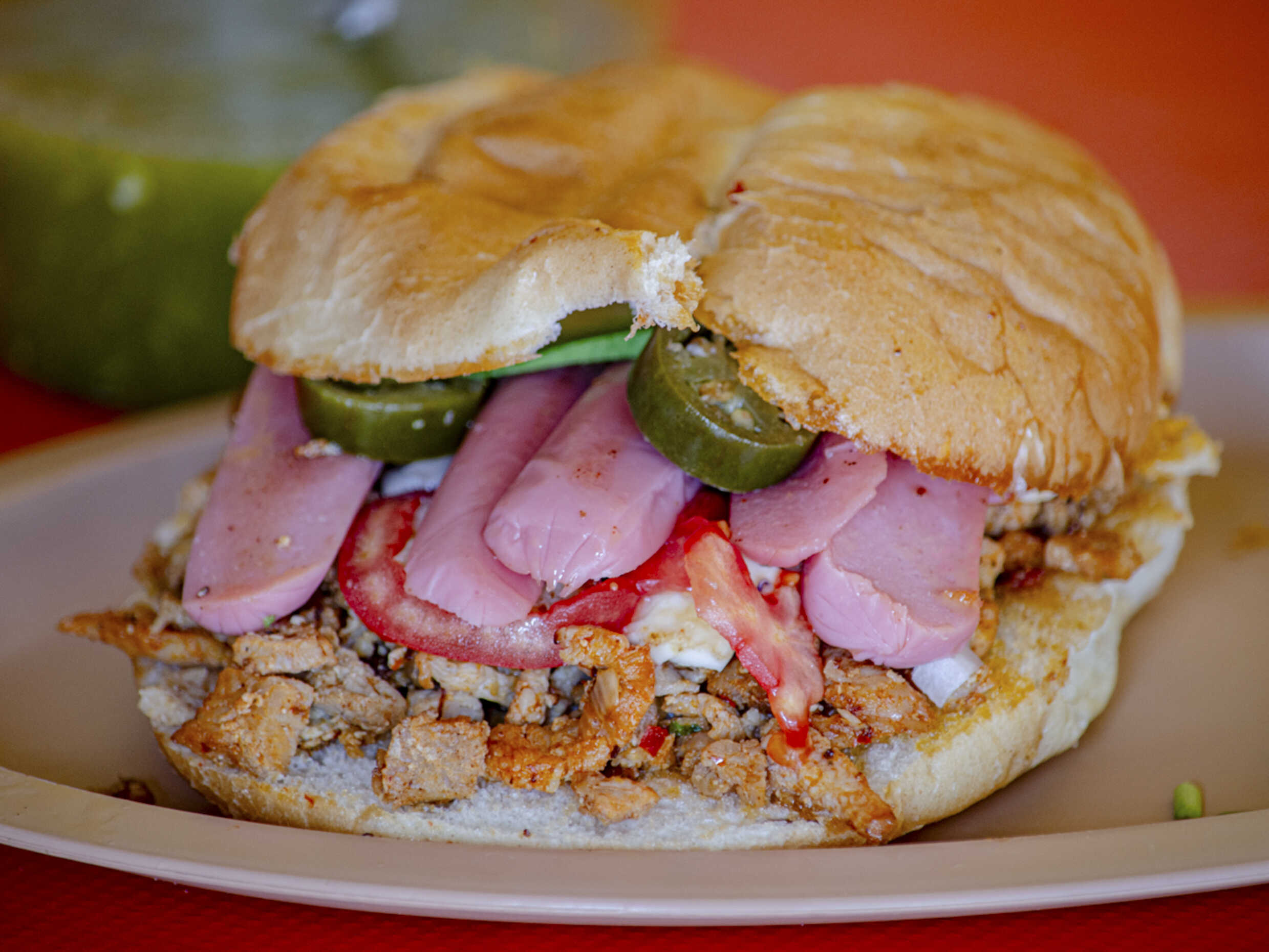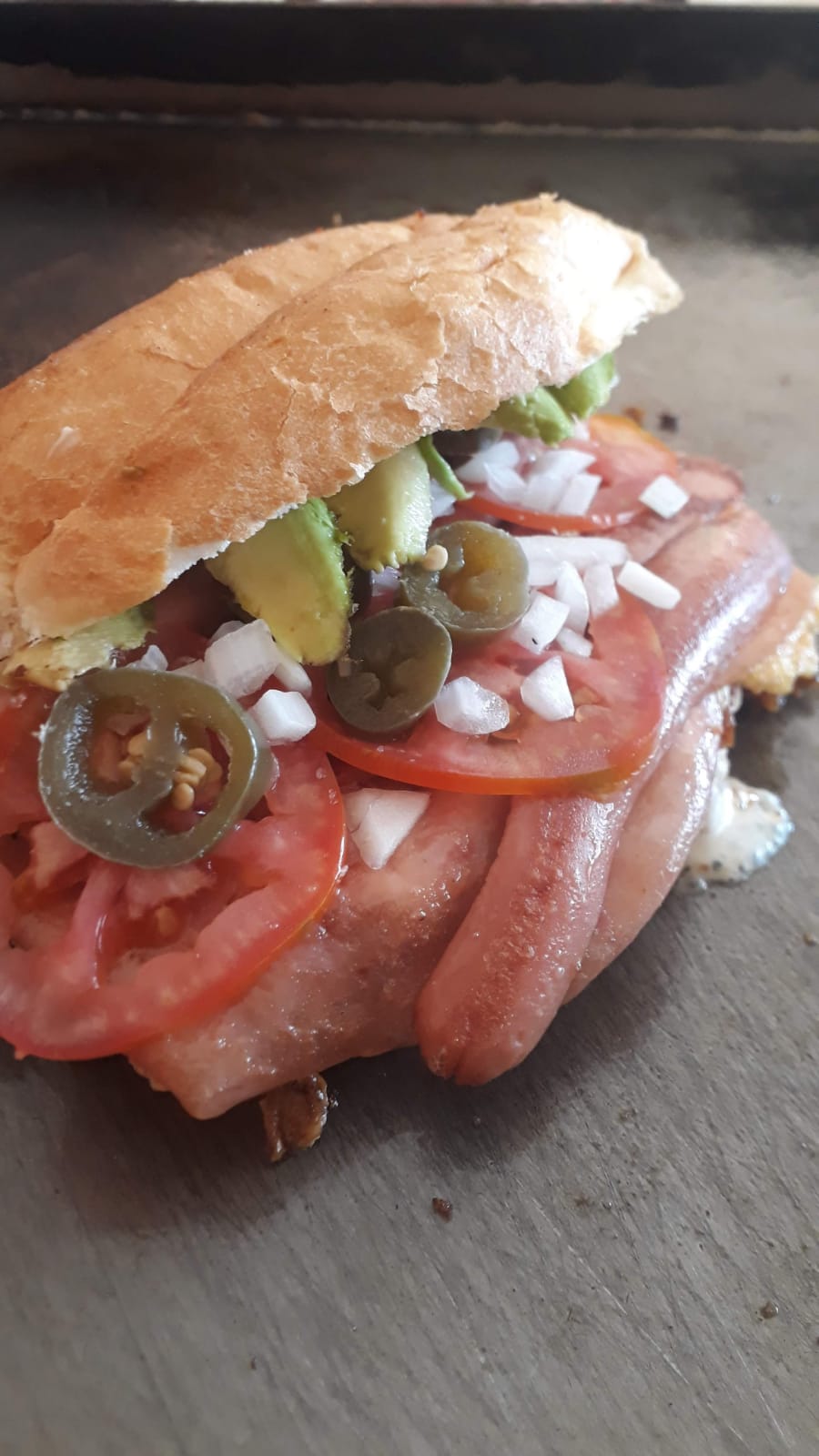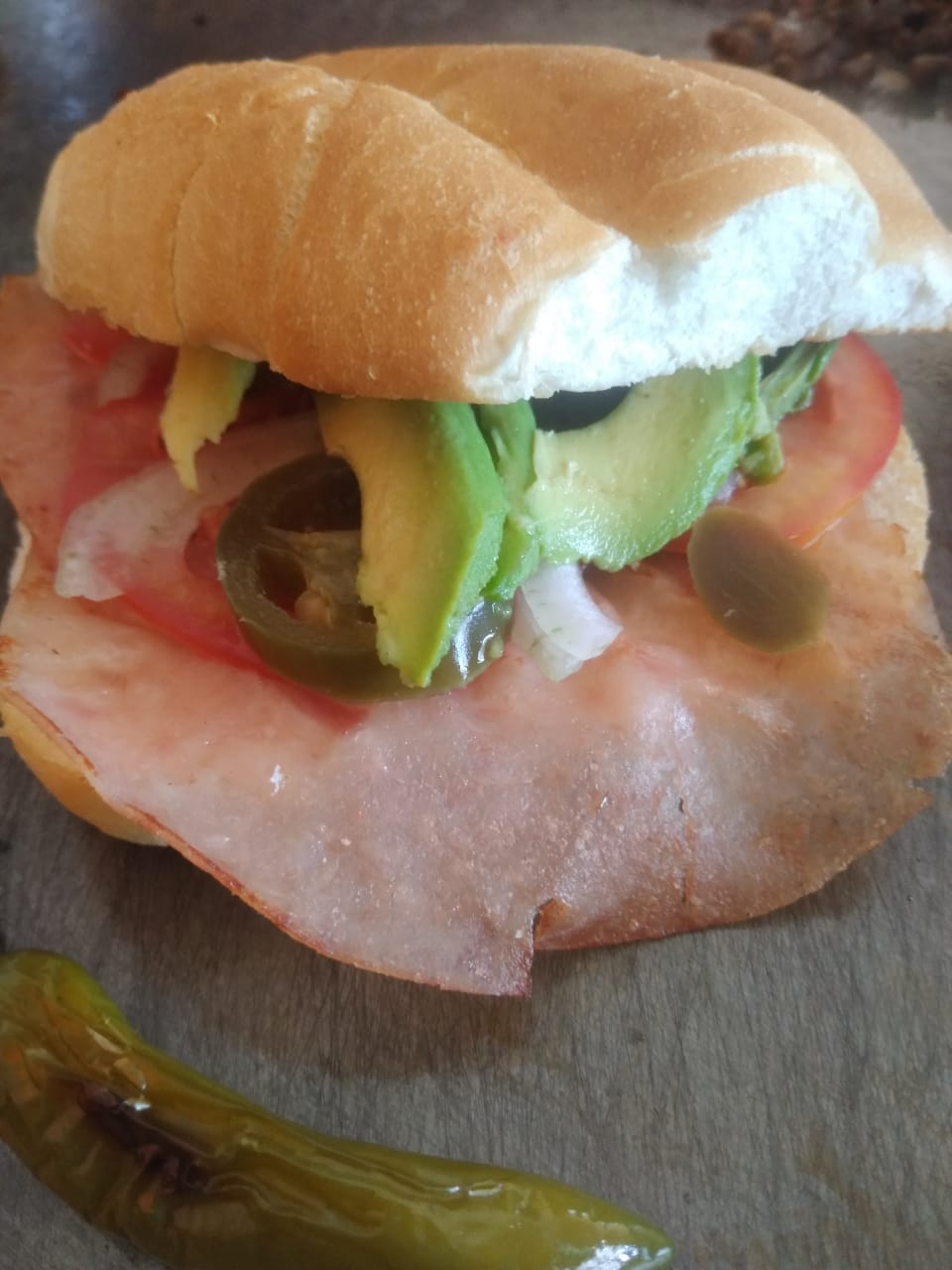 Jamón, jitomate, cebolla, chiles en vinagre y aguacate.